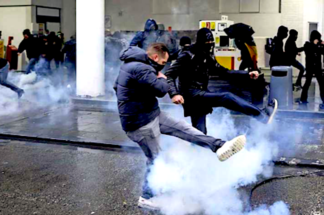 Traangas bij de Benzinepomp op Hoek van Chaussée de Charleroi en Rue de la Source (foto De Limburger)
