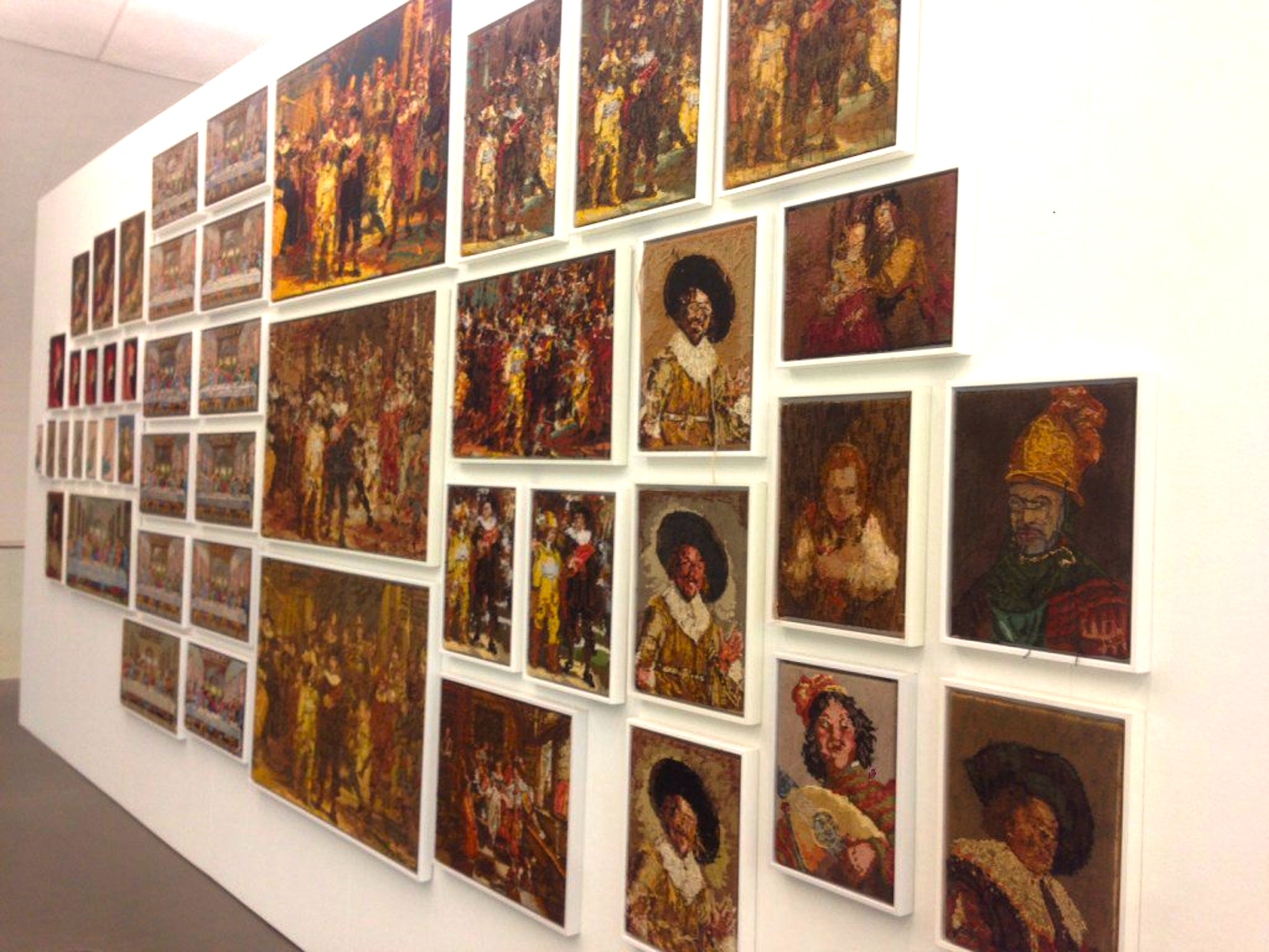 Nu vind ik een enkel omgedraaid borduurwerk – dat overigens aan de oorspronkelijke voorkant door Scholte is gesigneerd, de enige letterlijke bewerking waardoor zo’n borduurwerk een officieel kunstwerk van Rob Scholte is geworden, met bijbehorende marktwaarde, maar dit terzijde – niet zo boeiend. Wat het werk interessant maakt is de presentatie in series. Bijna duizend borduurwerken zijn over de wanden van de bovenste verdiepingen van De Fundatie verdeeld. Binnen die grote, wolkvormige groepen zijn de verschillende voorstellingen (Nachtwacht, Melkmeisje etc.) weer als series gegroepeerd. Tientallen Melkmeisjes bij elkaar maken indruk door het repetitieve karakter, waarbij grote verschillen in afwerking naar voren komen. Die veelvoudige presentatie zou je in principe ook met de voorkanten kunnen doen, maar dan krijg je een nogal steriele uitwerking van het idee. De meerwaarde van de bonte verzamelingen achterkanten ligt toch in het laten zien van het handwerk met de bijbehorende verschillen, waardoor het concept een zekere losheid krijgt, een zekere speelsheid. Een gelaagdheid van concept, materiaalkeuze, veelvoud, verscheidenheid en bewondering voor ambachtelijkheid, op de grens tussen kunst en kitsch. Heeft het op deze manier dan ook een esthetische meerwaarde? Toch wel: Scholte ziet een ‘onvoorstelbare schoonheid’ in zo’n achterkant, tot stand gekomen door de ‘liefdevolle aandacht die iemand erin heeft gestoken’ (interview NRC: https://www.nrc.nl/nieuws/2016/04/28/ik-bevind-me-weer-in-de-frontlinie-1612610-a675799).