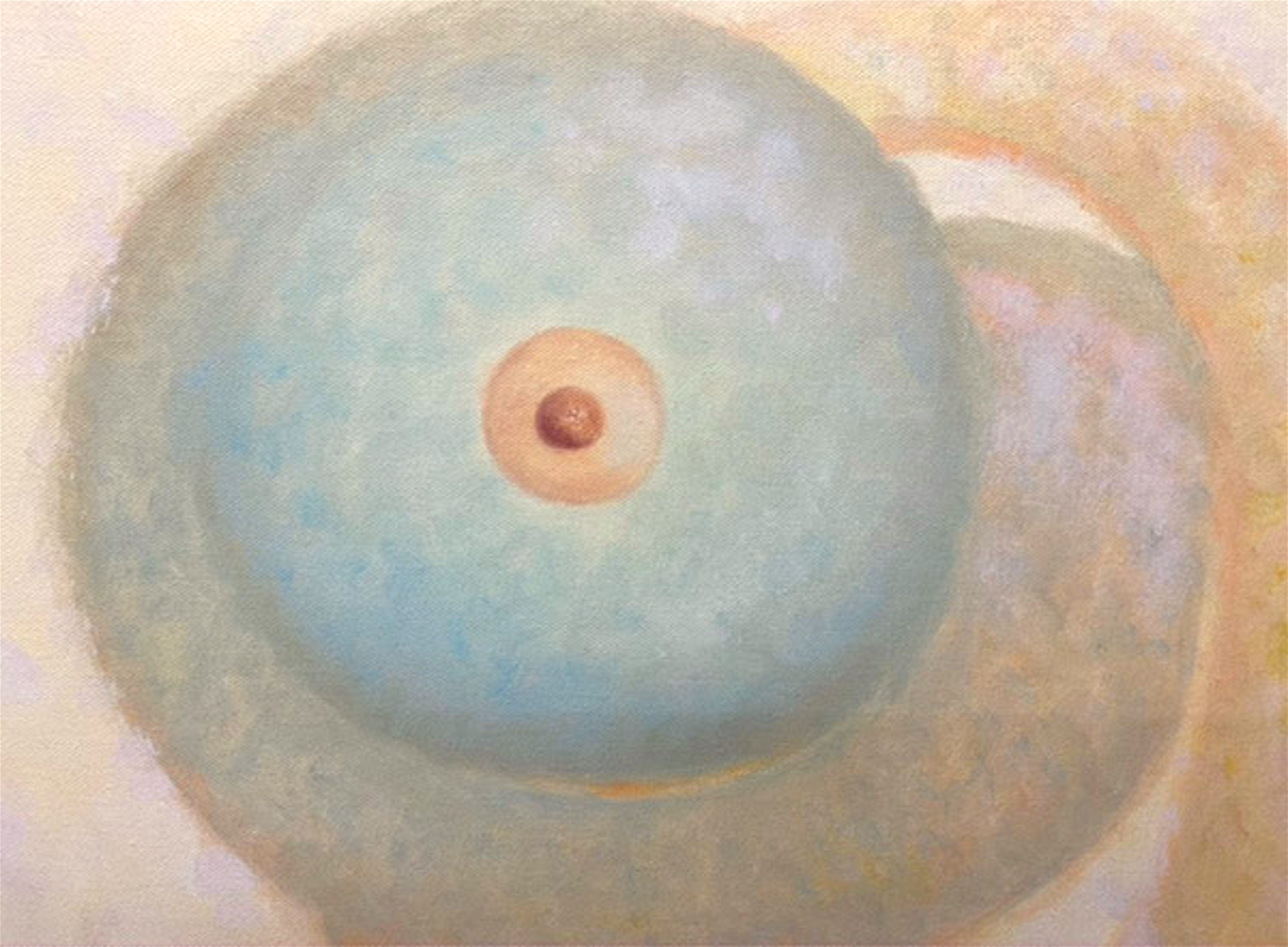 In een poederachtig fresco palet zijn twee zwevende blauwe bollen met elkaar verbonden door een gelijkmatig afgepelde sinaasappelschil. Precies in het midden van deze bollen zijn twee perfecte vleeskleurige tepels waar te nemen.