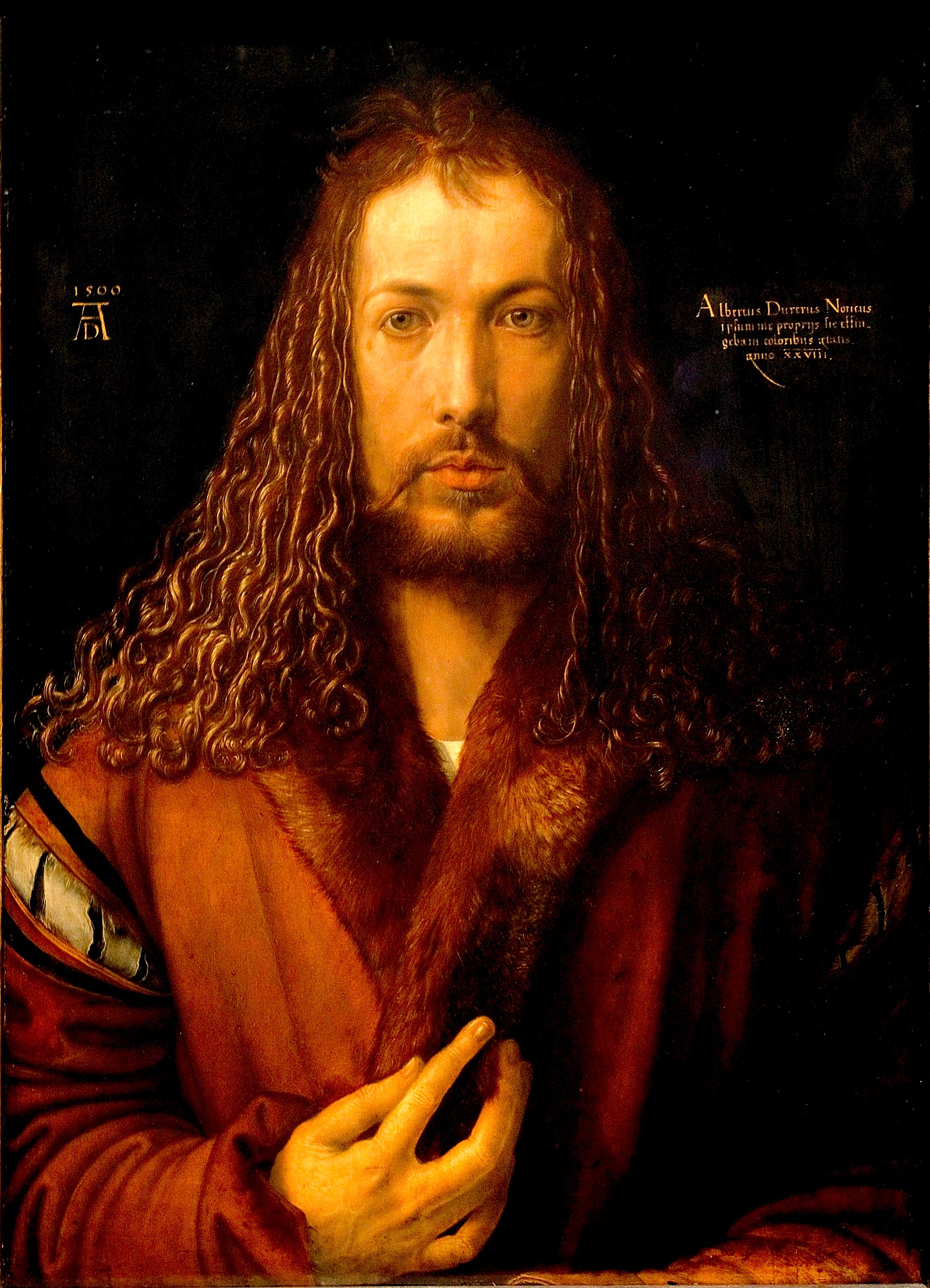 We zien hier (afbeelding 11, Zelfportret, München, Albrecht Dürer, 1500) het waarschijnlijk allereerste autonome zelfportret uit de kunstgeschiedenis. De innerlijkheid en zelfbewustheid spat er vanaf! Dürer beeldt zichzelf af in de houding die normaliter alleen voorbehouden was aan koningen of Christus. Ook past hij zijn gelaatstrekken aan aan die van Christus (zoals Hij vaak werd afgebeeld). Dat terwijl hij een diepgelovig man was; hij wilde er mee uitdrukken dat een groot kunstenaar zoals hij zelf iets van goddelijke scheppingsmacht in zich had. En dat in een tijd dat veel kunstenaars hun werk nog niet eens signeerden! Daarnaast getuigt het van grote moed om jezelf als Christus af te beelden in een tijd dat de ketterverbrandingen nog nauwelijks achter de rug zijn, en 20 jaar voordat Luther wordt geëxcommuniceerd. Dürer reisde naar Italië, maakte daar kennis met de status van de kunstenaars, met de klassieken, het geestelijk perspectief, en verbond dat met zijn intens beleefde geloof, zijn gevoel voor de eigen autonomie en zijn ongeëvenaarde bestudering van de natuur.