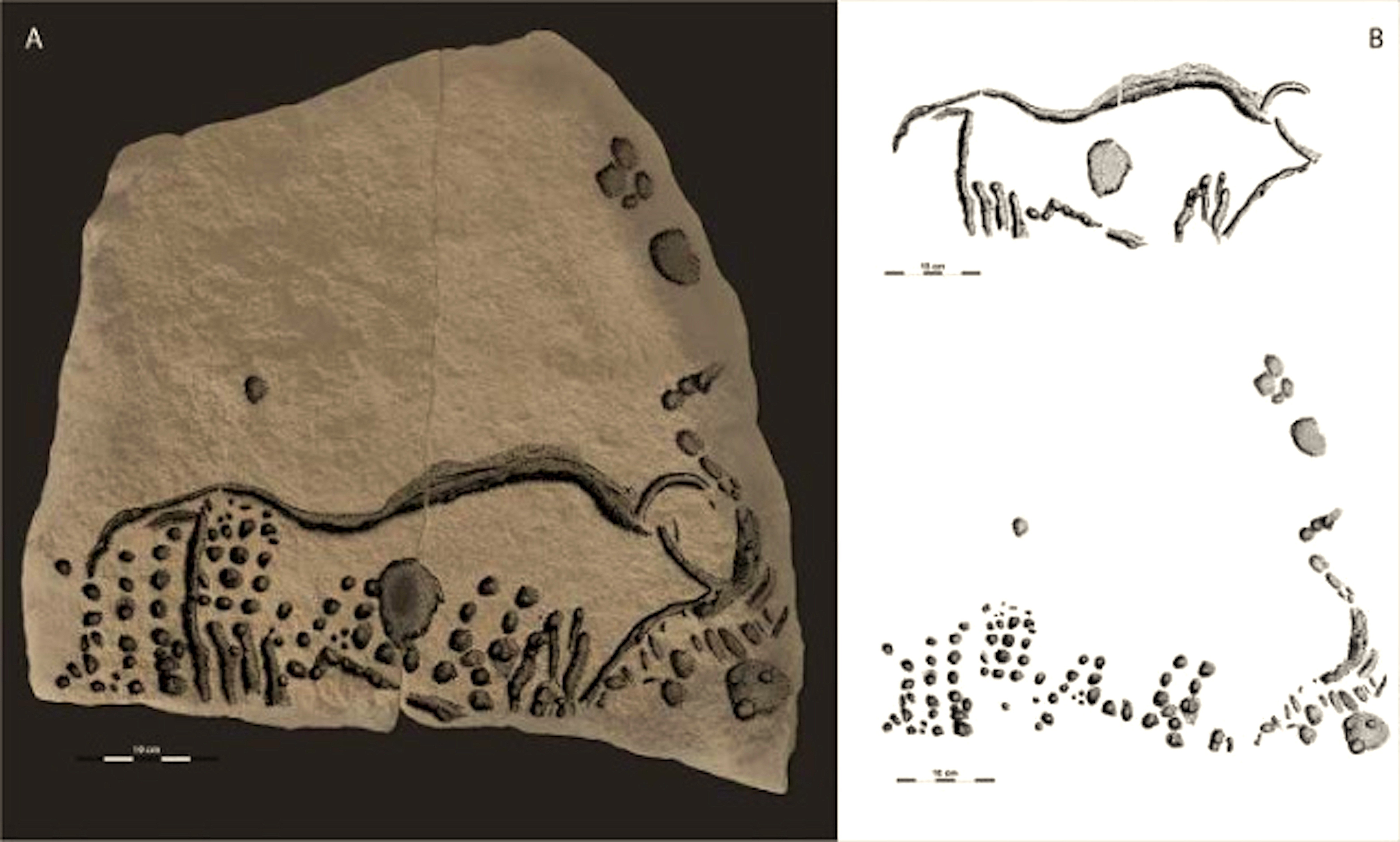 In 2014, White and his colleagues returned to Cellier, seeking intact deposits that would allow a better understanding of the archaeological sequence at the site and its relationship to other Aurignacian sites. They had their fingers crossed that the new excavation might yield new engraved images in context, but nothing prepared them for the discovery of the 16 stone blocks detailed in the Quaternary International article. One of these, broken in half prehistorically, was found in place with a radiocarbon date of 38,000 years ago.