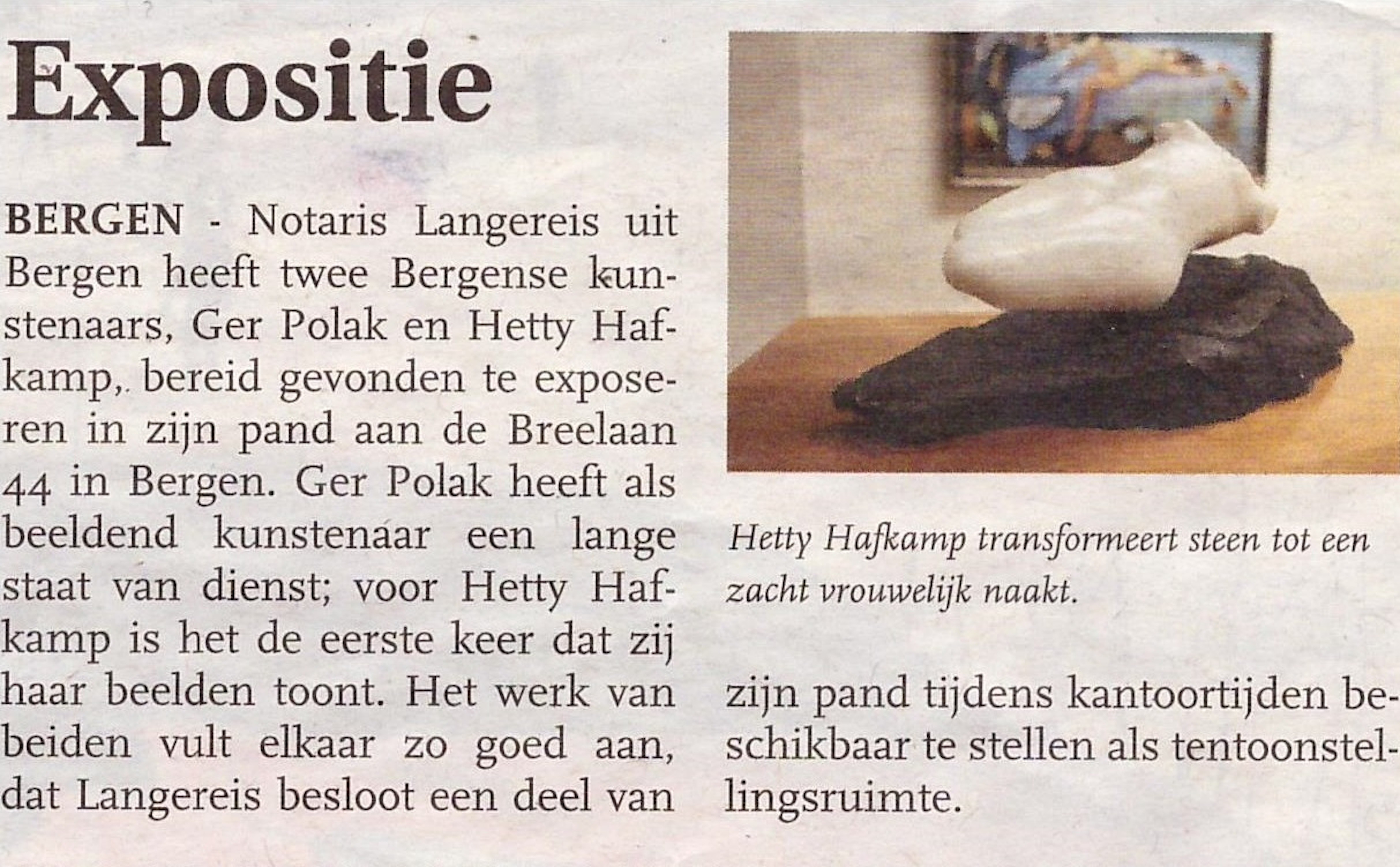 Bergens Nieuwsblad – Burgemeester van Bergen (N.H.) Hetty Hafkamp transformeert steen tot zacht vrouwelijk naakt, 30 december 2015