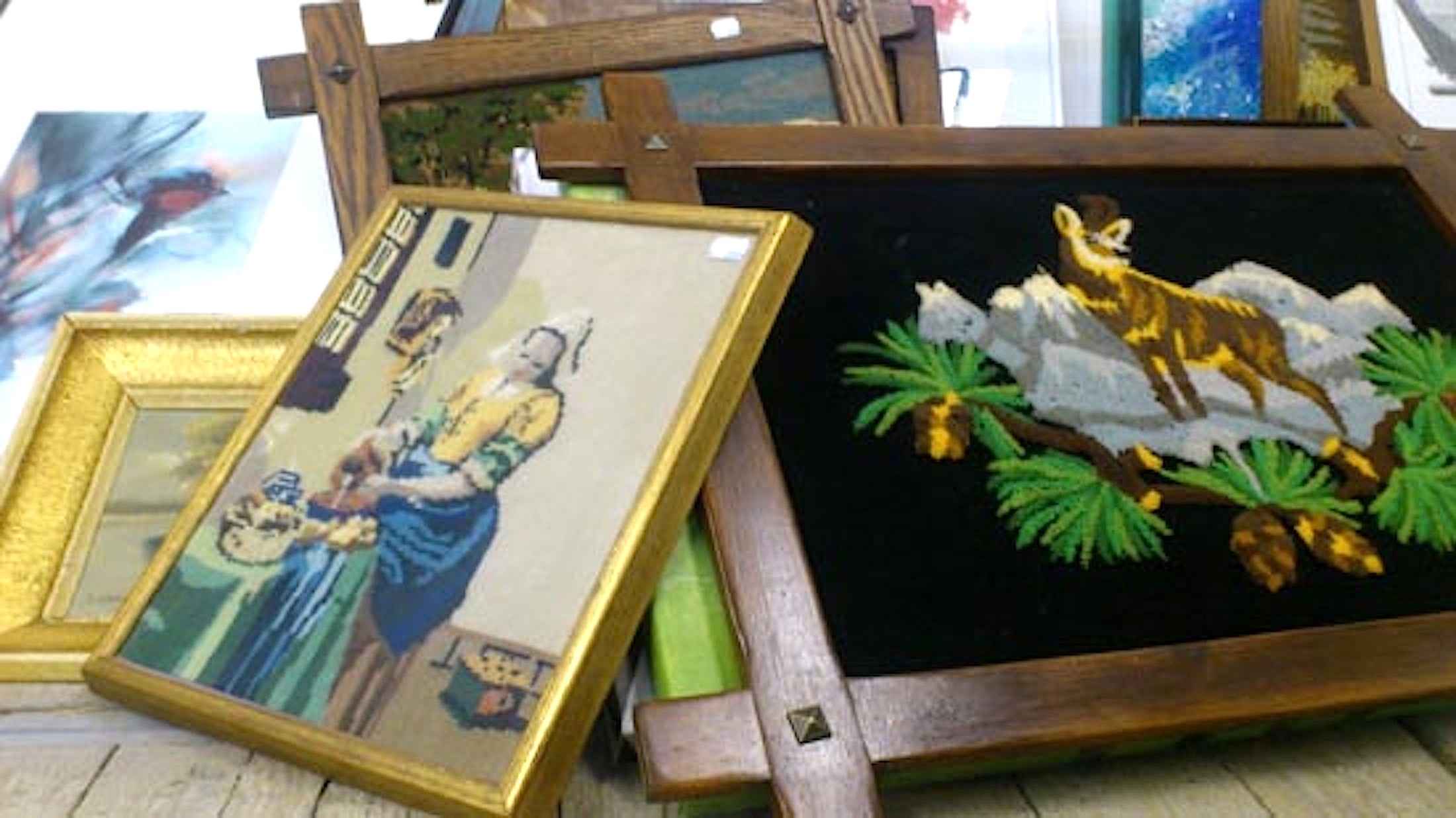 Vandaag nog maar eens met een volle auto naar het magazijn van de kringloopwinkel gegaan waar ze blij zijn met onze spulletjes. Het gaat trouwens goed met ‘t Pakhoès sinds de heropening van 21 november 2014. Ik was er nog niet geweest, dus hoogste tijd om eens een kijkje te gaan nemen. Mijn oog viel gelijk op Het melkmeisje dat uitgevoerd is met wollen garens in kruissteek. De laatste jaren zijn dit soort borduurwerken erg populair. Hiervan worden tassen gemaakt, stoelen worden ermee bekleed, vloerkleden worden ervan gemaakt en Rob Scholte kocht de borduurwerken om ze vervolgens te exposeren, niet de voorkant, maar de achterkant.