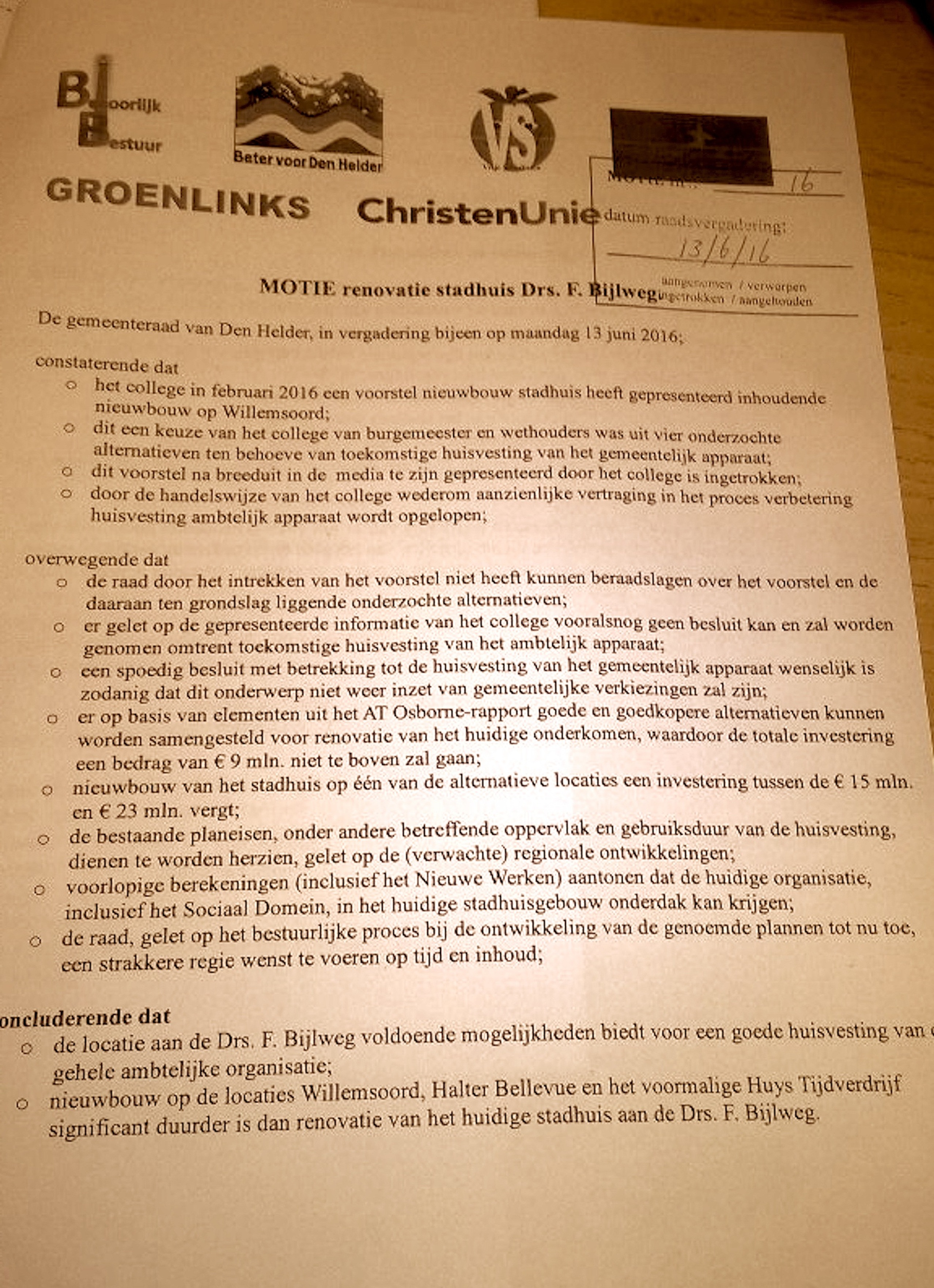 Den Helder – De Helderse gemeenteraad heeft maandagavond laat een motie aangenomen waarin het college wordt opgedragen om uiterlijk per 1 augustus te komen met een plan voor verbouw van het huidige stadhuis. Zodat er medio 2017 kan worden gestart met de werkzaamheden.