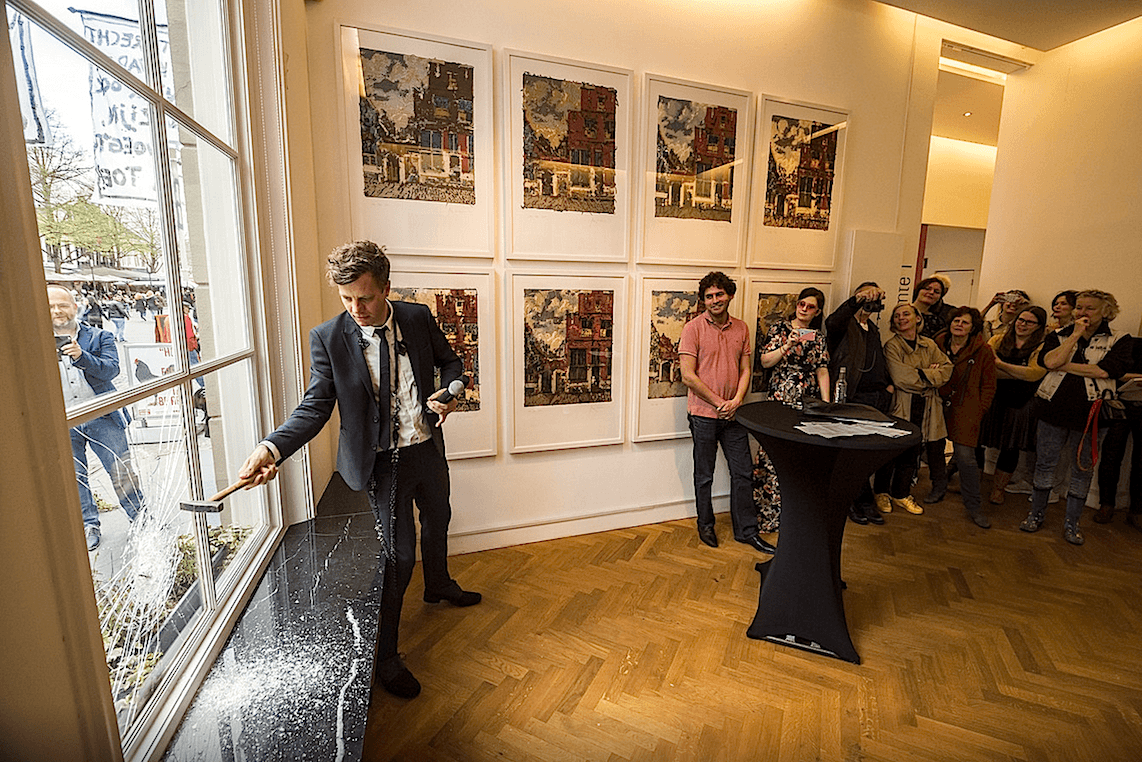 Enschede – De expositie ‘How on earth should this be art?’ van gastcurator Tinkebell bij Concordia werd zaterdagmiddag met het intikken van een ruit symbolisch geopend. “Kunst moet de straat op”, zei kunstenaar en social designer Tabo Goudswaard, terwijl hij niet zonder moeite een gat sloeg van de expositieruimte naar de Langestraat.