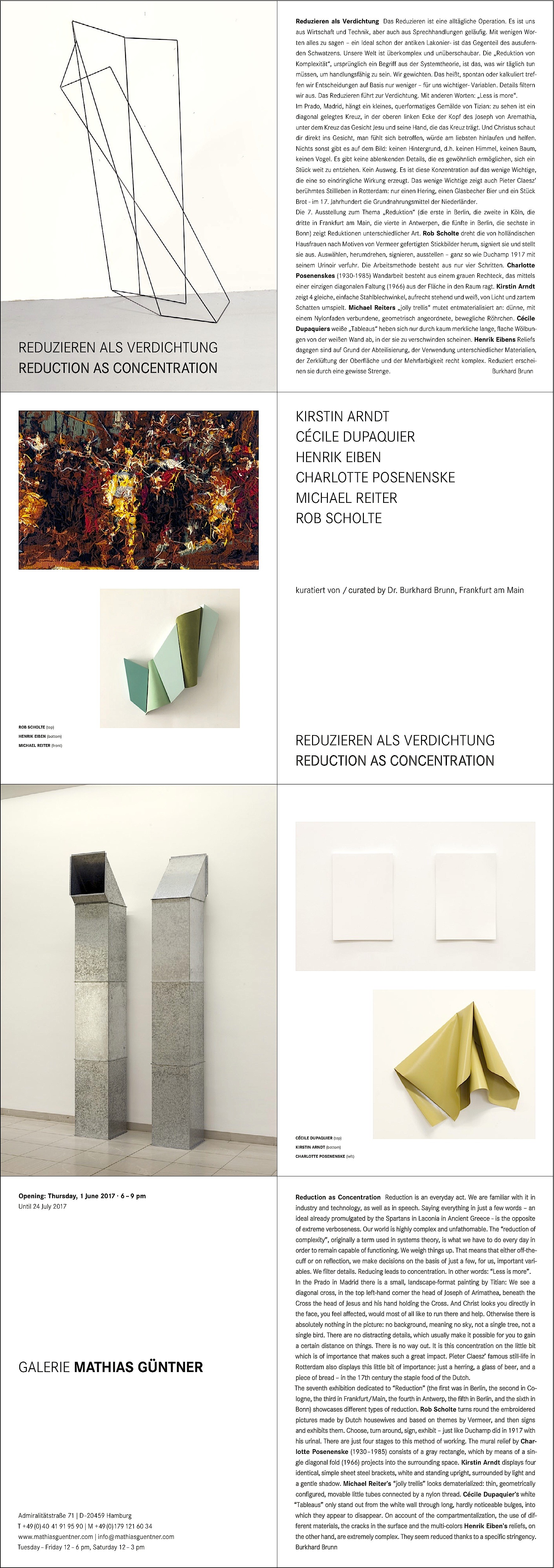 Die 7. Ausstellung zum Thema „Reduktion“ (die erste in Berlin, die zweite in Köln, die dritte in Frankfurt am Main, die vierte in Antwerpen, die fünfte in Berlin, die sechste in Bonn) zeigt Reduktionen unterschiedlicher Art. Rob Scholte dreht die von holländischen Hausfrauen nach Motiven von Vermeer gefertigten Stickbilder herum, signiert sie und stellt sie aus. Auswählen, herumdrehen, signieren, ausstellen – ganz so wie Duchamp 1917 mit seinem Urinoir verfuhr. Die Arbeitsmethode besteht aus nur vier Schritten. Charlotte Posenenskes (1930-1985) Wandarbeit besteht aus einem grauen Rechteck, das mittels einer einzigen diagonalen Faltung (1966) aus der Fläche in den Raum ragt. Kirstin Arndt zeigt 4 gleiche, einfache Stahlblechwinkel, aufrecht stehend und weiß, von Licht und zartem Schatten umspielt. Michael Reiters „jolly trellis“ mutet entmaterialisiert an: dünne, mit einem Nylonfaden verbundene, geometrisch angeordnete, bewegliche Röhrchen. Cécile Dupaquiers weiße „Tableaus“ heben sich nur durch kaum merkliche lange, flache Wölbungen von der weißen Wand ab, in der sie zu verschwinden scheinen. Henrik Eibens Reliefs dagegen sind auf Grund der Abteilisierung, der Verwendung unterschiedlicher Materialien, der Zerklüftung der Oberfläche und der Mehrfarbigkeit recht komplex. Reduziert erscheinen sie durch eine gewisse Strenge.