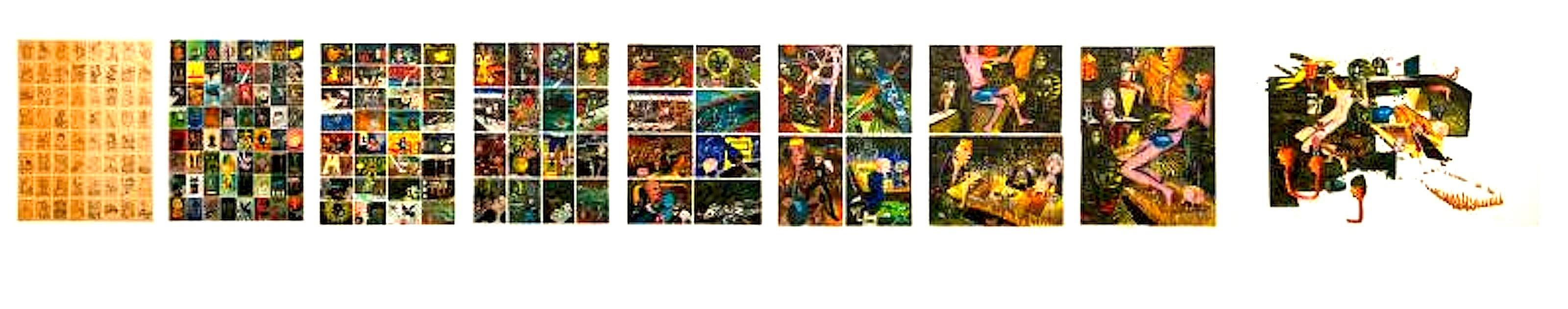 Het eerste blok is door de kunstenaars later toegevoegd, om inzichtelijk te maken hoe ze waren begonnen, met de 64 kleurboekplaatjes. Het tweede blok laat de ingeschilderde versies zien. Vanaf het derde blok zijn ze de plaatjes gaan combineren. Steeds worden twee kleurplaten samengevoegd tot een nieuw beeld dat ze in het volgende blok zetten; net zo lang tot alle vellen met elkaar gecombineerd zijn in één groot beeld, het achtste blok. Om te zien wat er onderweg met de oorspronkelijke beelden is gebeurd, laten Derks en Scholte in het negende blok alles weer uit elkaar vallen in 64 onderdelen, en plaatsen de beelden terug, voor zover mogelijk, op de plekken die ze in het tweede blok hadden. Het is dus een proces van constructie en vervolgens deconstructie, een methodiek die begin jaren tachtig uiterst actueel is – No Future in optima forma.