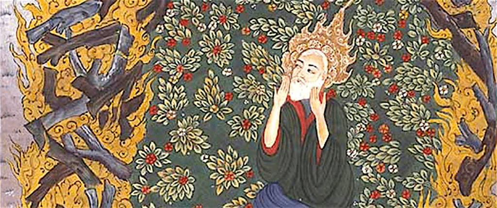 Dit plan beviel de koning en evenzo zijn onderdanen, zodat door het ganse land een uitbundige blijdschap heerste en er overal maaltijden werden gehouden. In het paleis werd een groot feest aangericht en een verblindende pracht en praal ten toon gespreid. Nu werd Abraham ontboden en hij verscheen. Hij liep de vorsten en hoogwaardigheidsbekleders voorbij tot voor de troon van Nimrod, greep die troon vast, schudde haar hevig en riep met luide stem: “Gij, Nimrod, verworpeling, die de ware God loochent, de God, die leeft en bestaat; getuig en zeg: God is enig en geen tweede bij Hem; Hij heeft geen lichaam en leeft eeuwig; Hij sluimert niet en Hij slaapt niet. Beken dat ik Abraham ben, Zijn knecht, die in Zijn naam spreekt.” Terwijl Abraham dit zei, werd zijn stem steeds luider en de godenbeelden, die in het rond stonden, begonnen te wankelen en stortten ter aarde. Toen de vorsten dit zagen, vielen ook zij op hun aangezicht en de koning met hen. Zijn hart beefde en zijn geest begaf hem; zo bleef hij twee uur bewusteloos liggen. Toen ontwaakte hij als uit een droom en hij vroeg Abraham: “Was dat uw stem of die van God?”, waarop Abraham zei, dat hij slechts de stem van een nietig schepsel van God had gehoord, waarop Nimrod God begon te loven als de koning aller koningen. Toen verliet Abraham het paleis van Nimrod. Staal, 50-56; zie https://sargasso.nl/jonge-jaren-abraham/ en https://en.wikipedia.org/wiki/Nimrod; dieper https://thetorah.com/why-the-midrash-has-abraham-thrown-into-nimrods-furnace/ en https://bahaiteachings.org/casting-abraham-into-the-fire.