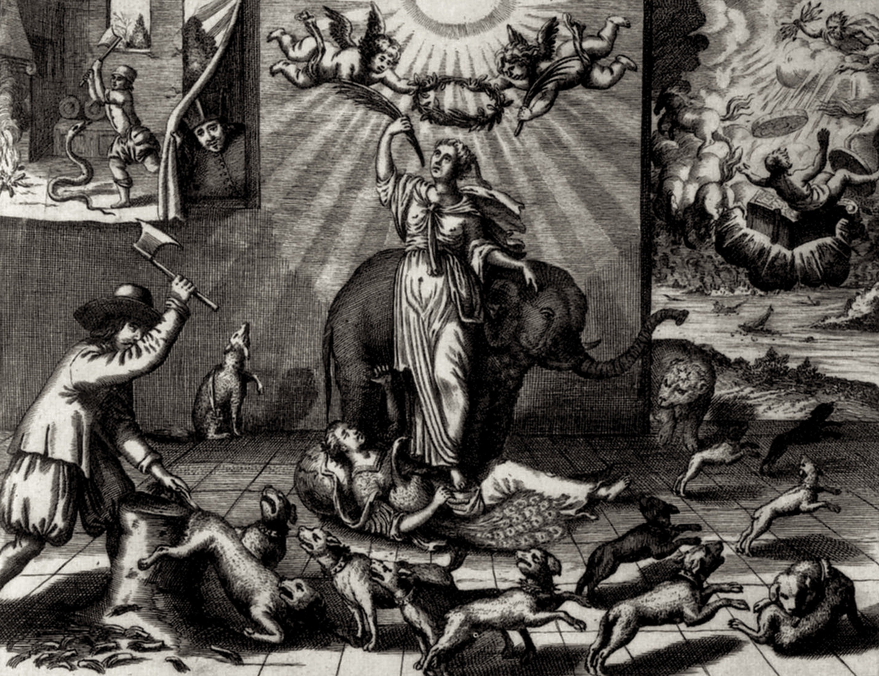 Wy en willen niet twijffelen, of de Werelt sal schrander genoegh wesen om dit Sinnebeelt nae sijn eygen oogh-merck te verstaen en uyt te leggen, aengesien stomme Beelden oock tot de verstandige spreecken. Evenwel sullen [wy] in’t gemeyn iets seggen, om van eenige beter gevat, oft immer niet misduyt te worden. Die geen ooren heeft als een Adder, noch schillen op sijn oogen, weet, dat de Engelsche Natie boven alle volcken van Europa uytmunt in laetdunckentheyt en eygen hovaerdye, sich selven inbeeldende, dat [sy] geen gelijcke in de Werelt heeft, noch oock yemandt behoorde te erkennen neffens hem: want gelijck hare Landt-palen door de Zee van andere Landen en Volcken zijn afgescheyden, soo meynense dat hunne gemoederen mede van andere behooren vervreemt te wesen. En gheen dingh heeft meerder dese hovaerdighe waenmoedt in haer opgequeeckt, als geduurige weelde, en heerlicke zegeninghen, die sy honderden van jaren herwaerts, soo te lande als ter Zee, hebben genooten; niet alleen in de verheringh, en vast-stellingh, van binnen landtsche Rijcken, onder een kroon, met den naem van Groot-Brittannie, maer oock buyten hare wallen, in andere Koninckrijcken en Landen. Dan alsoo sy hier door, alle vriendt[-] en nabuurschap, en met een alle deughden, van ootmoedt, liefde en trouw hebben onder de voeten ghetreden, soo heeft het Godt ten laetsten verdrooten, en door verscheyde wegen gesocht, haer tot bedenckinge van haren Staet te brengen, zedert ses en twintigh jaren herwaers; eerst door een vervaerlicke burger krijgh, waer in meer menschen bloedt is vergooten, als in die van Romen, onder Sylla en Marius, gaende soo verre, dat haren Vader, en geschwooren Beschermer, openbaer, by rechts-plegingh is ter doodt gebracht; sijne Na-zaten, de Konincklicke Erfgenamen, verstooten en uyt den lande verbannen, hebben by vreemden, met kleene barmhertigheydt moeten om swerven: een dienaer, jae een Tyran vat de Regeeringh op, en belast de gemeynte soodanigh, dat vereelde schouderen de selve niet lange konden dragen; en nae de selve, komt sulck een geest van verblindinge en verwarringe over dit volck, dat in twee maenden tijdts, het Schip der Engelsche Regeering, van vijf, nochtans alle onervaren Stuur-lieden, wierdt bestiert; tot dat den Hemel wederom sijne genade vernieuwt, aen het vluchtighe Konincklicke Huys, ghevende hun haer ’s Vaders Stoel en Kroon. Terstondt steygheren sy weder topwaerts, alle Gesanten versoecken hun vrede, en byna niemandt scheen geluckigh als Engelandt: Maer dese weelde begon al voort wederom buyten spoor te stappen, de rechtvaerdighe verbintenissen na te laten, niet te vreden te wesen met het geen sy hadden, trachtende na de rijckdommen en goederen van anderen, ’t welck hun nochmael heeft doen steygeren, doch op den top van schande en oneer elk een bespeurende hunne gewelderye: te landewaert in Africa en America, ter Zee met rooven en stroopen, van hunner nabuuren Schepen en Goederen; eenige jaren aen een, tot dat het den Almachtigen heeft verdrooten, en door de verbintenisse van ettelicke vrede-lievende Potentaten en Staten, haer, als een Faëton van den troon der hooghmoedt hebben neder-ghestort, niet door den blixem van Jupiter, maer door hun zee Kasteelen en Scheeps-vloot, soo datse eyndelick met al haer hoovaerdye, door de ootmoedt, die hier leunende op den Olifant, haer patroon van nederigheyt, werdt afgebeeldt, en die haar hulpe alleen van den Hemel had, zijn t’ondergebracht, en niet mogelick in voorgaende luyster op te staen, maer met hunne oude en trouwe nabuuren, die hun lang in haren boesem hebben ghekoestert, hoewel sy gelijck de verwarmde Slange toen hun weldoender sochten te beschadighen, evenwel, een goede, vaste, en eerlicke vrede sullen moeten aengaen, na welcke wy verlangen, hoewel rusten op een stercker als sy.