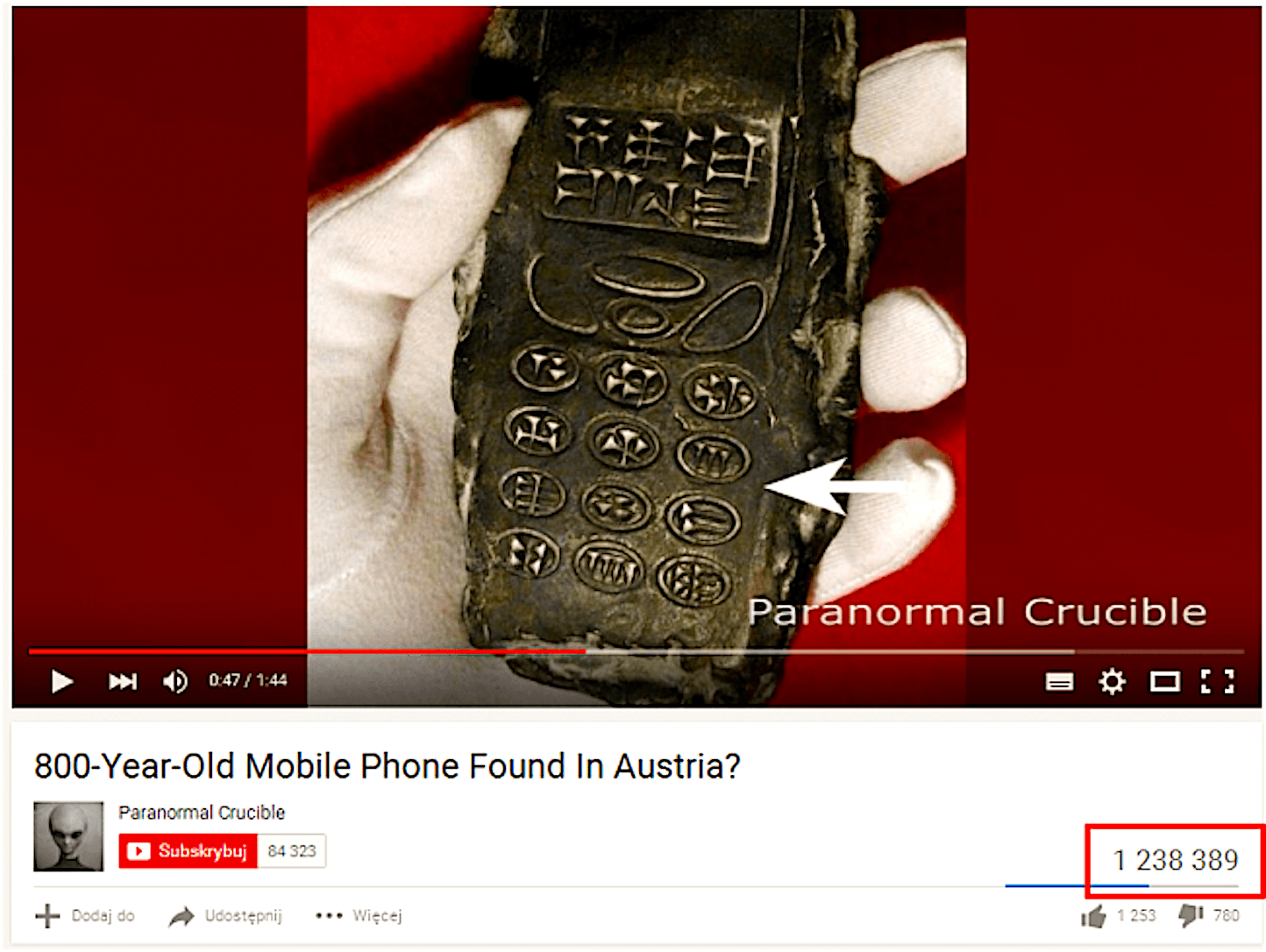 Door Art Replik is een screenshot gemaakt van de Paranormal Crucible video op YouTube, gemaakt in januari 2016, waarop de teller staat op 1.871.574. De screenshot boven het artikel is uiteraard eerder gemaakt, de teller staat op 1.238.389, hetgeen begin januari geweest zal zijn. De volgende video op de afbeelding van Art Replik is een onbekende, van Paranormal World (2:25) met de titel ‘Claims bizarre 800 year old ‘mobil[e phone’] object has been dug up by archae[ologists in Austria]’ met 103.316 views. De bijgevoegde afbeelding wordt verderop besproken.