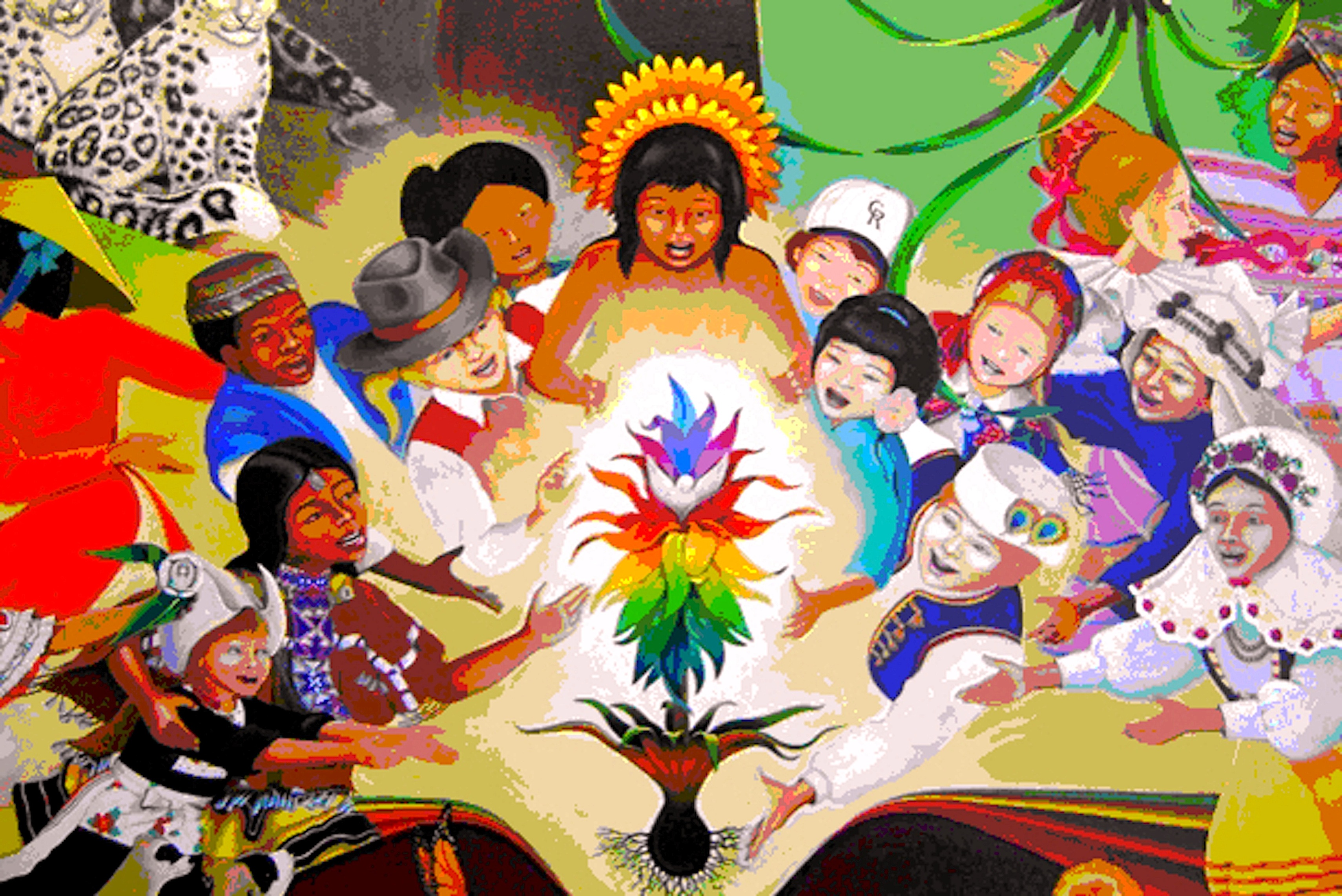 Op de boven afgebeelde muurschildering heeft hij de mensheid afgebeeld, voorgesteld door kinderen van de wereld gekleed in nationale of folkloristische kostuums. We zien een Nederlands meisje links van de bloem. Ze bewegen zich van alle kanten naar het centrum en lachen in hun poging onze natuurlijke leefomgeving te rehabiliteren. Ook op de schildering ‘De Kinderen van de Wereld Dromen van Vrede’ is een meisje in een Nederlands folklorekostuum te zien exact in het midden.