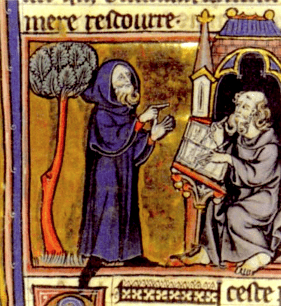 Uitgeput zit hij neer bij een bron, peinzend over zijn droom, als Merlijn in de gedaante van een 4-jarige jongen komt en zegt te weten wat hem bezig houdt: hij heeft zijn eigen dood gedroomd. En hij vertelt de droom aan de koning, die hem voor een duivel houdt, maar hij krijgt de bal terug: hij is zelf een duivel, want hij heeft vleselijke gemeenschap gehad met zijn zuster. Het kind vertelt hem zijn afkomst, Arthur gelooft het niet (want het kind was toen nog niet geboren), het kind gaat weg en komt terug als grijsaard, die zich de droom laat vertellen en onthult, dat de door hem verwekte ridder zijn land zal verwoesten. Arthur wil het kind doden, maar daar wenst Merlijn niet aan mee te werken (om zijn zielenheil), al onthult hij, dat het op 1 Mei te Logres geboren zal worden. Merlijn maakt zich bekend en vertelt hem zijn geboorte, etc., maar Monseigneur Robert de Boron wil immers niet in herhalingen vervallen en zo zijn boek langer maken, maar juist zo vlot mogelijk verder vertellen. Dan bewijst Merlijn ten overstaan van de baronnen, dat Arthur de zoon is van de eveneens aanwezige Ygerne en Uterpendragon met als getuige Urfijn en overgedragen werd door hem, Merlijn, aan Auctor, een ‘achterleenman’ (iemand van lage adel die op eigen grond woont). En allen zijn blij.
