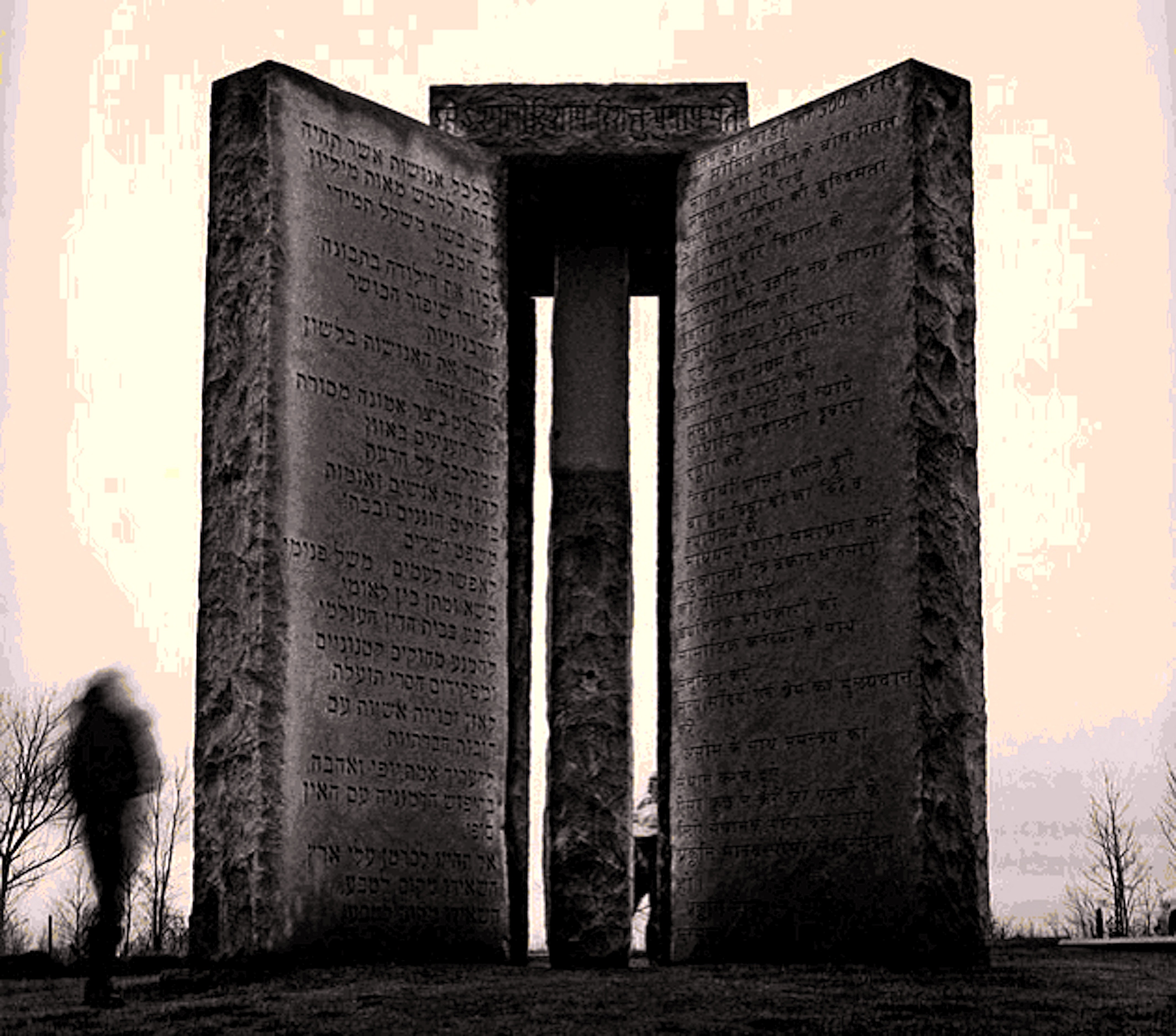 In Elbert County, in Georgia, in the VS, staat sinds 1980 een uitermate merkwaardig monument, genaamd ‘De Georgia Guidestones’. Het is zo’n zes meter hoog en gemaakt van zes granieten platen, die in totaal meer dan 200 ton wegen. In het midden staat een granieten plaat, waaromheen vier stenen gerangschikt staan. Op deze vijf astronomisch uitgelijnde platen rust een dekplaat. Op de granieten zuilen staat een tekst, waarin in acht moderne talen (Engels, Spaans, Swahili, Hindi, Hebreeuws, Arabisch, Klassiek Chinees en Russisch) de tien hoofdpunten worden gegeven, aanwijzingen voor de overlevenden van een toekomstige wereldramp voor een nieuwe en vooral betere beschaving.