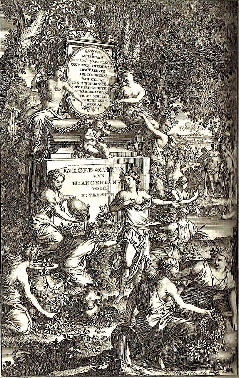 Hoe groot het vermogen der Liefde, die hevige hartstocht, is, blykt niet alleen door de dagelyksche ervarenheid, maar ook door oneindige voorbeelden der aloudheid: veelen hebben hunne kroonen, lauwertakken, en yvore lieren aan die Godheid opgeofferd; doch weinigen, zelfs onder de Heidenen, zyn zo ver gekomen, dat zy hun leeven, dat waarde pand, uit wanhoope van ’t beminde te genieten, hebben willen derven. Men zouw het ongeval van Isis, die zich om zijn Anaxarate, by den Dichter der verwonderlyke Herscheppinge, aan de deure verhangt, slechts voor een ongelooflyk verdichtzel hebben aangenomen, ten zy, nu byna twee eeuwen geleden, een Napolitaansch edelman, HIERONYMUS ANGERIANUS, een zeer aartig Minnedichter, door zynen zelfmoord dit niet hadde waarschynlyk gemaakt. Dit verwonderlyk geval, en de achting, die ik voor zyne schoone gedachten, die allezins in zyne versen uitblinken, altyd heb gedraagen, hebben my bewoogen, hem een Lykgedachtenisse toe te stellen, waar in ik naar de wyze der aloude Heidenen (want by zulk een daad passen deeze sieraaden) zyn ontydige dood, en hevige liefde, doe ophaalen en beklaagen door de Napolitaansche Berg-[,] Bosch- en Zeegodinnen. Schooner toneel als die landstreek, en aartiger perzonaadjen zou ik niet hebben kunnen verkiezen; dit alleen wenschte ik, dat myn laagzingende Zangnimf de stoffe had kunnen evenaaren. Ik heb de bergen en stroomen hun oude naamen doen behouden om beter te voegen by myn verdere wyze van schryven; dus noem ik Vesevus en Vesbius[1] den berg, dien de Italianen jegenwoordig Monte Sommo heeten enz.