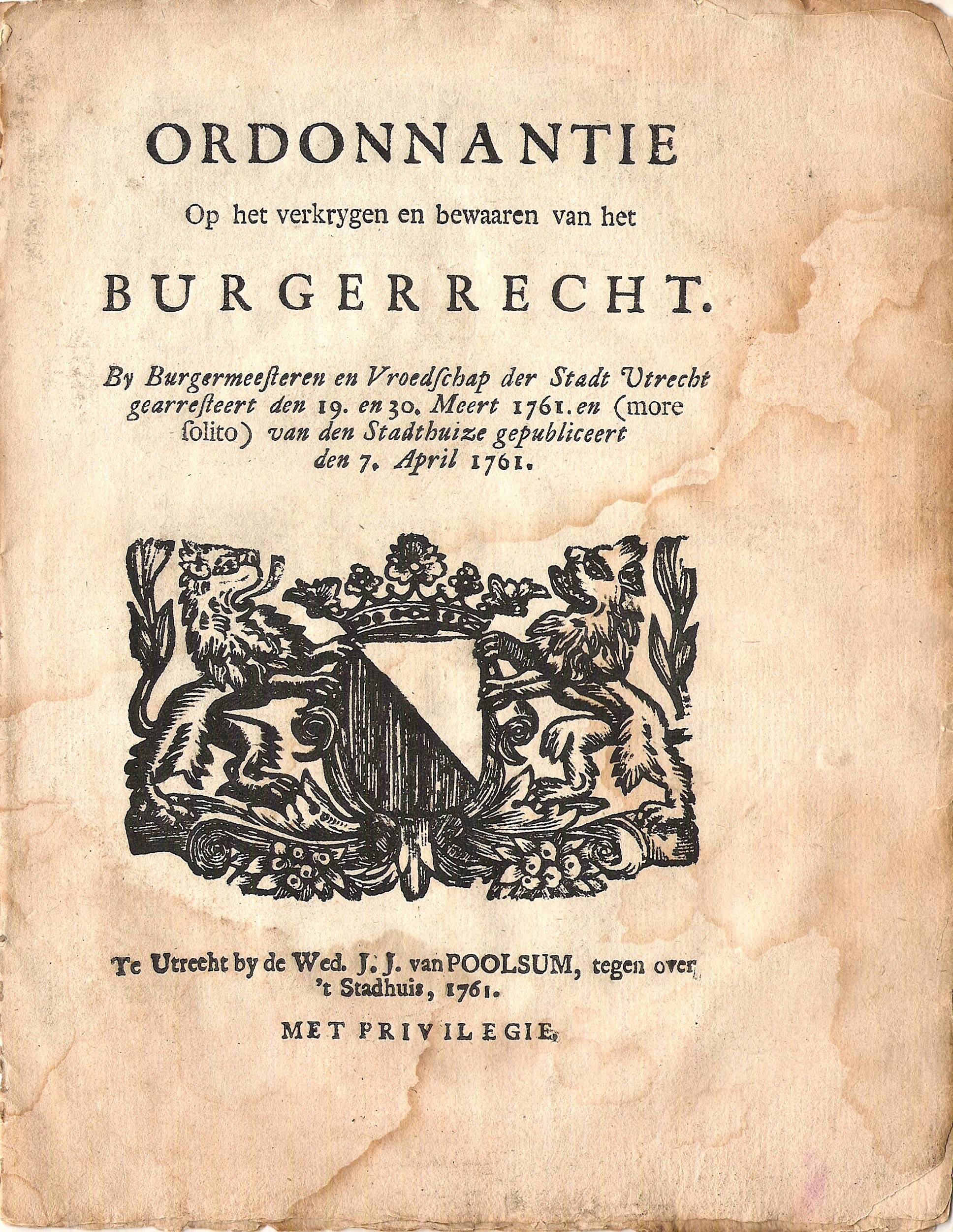 By Burgermeesteren en Vroedschap der Stadt Utrecht gearresteert den 19. en 30. Meert 1761. en (more solito) van den Stadthuize gepubliceert den 7. April 1761.
