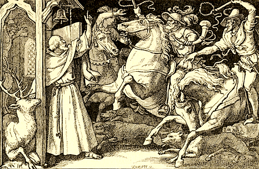 Volgens Vollmer gaat het bij het “Woedende Leger” om een door heel Duitsland verspreide sage over een nachtelijke spooktocht, die met angst aanjagend geraas, in het bijzonder geluiden van de jacht, door de lucht trekt en bestaat uit mannelijke en vrouwelijke gestalten, naast schimmen van paarden en honden, ook dikwijls kinderen. Dit oeroude geloof hangt nauw samen met het Duitse heidendom, zoals de naam al aangeeft (Woeden = Wodan). Na het intreden van het christendom raakte het Woedende Leger al meer gedemoniseerd en veranderde Wodan in de Duivel of in de Wilde Jager, soms een anonieme, maar soms ook een aan een half historische persoon vastgeknoopt, bijvoorbeeld Jägermeister Hans von Hacklenberg (https://actingouttheatreco.org/2018/09/03/beyond-the-hollow-the-wild-huntsman/) oftewel Hackelberend (zie https://nha.courant.nu/issue/IJC/1937-12-22/edition/0/page/3), die een everzwijn doodde en door een evertand zich dodelijk verwondde aan zijn voet. Op zijn sterfbed toonde hij geen belangstelling voor de hemel en zei liever te jagen, vanwaar hij veroordeeld werd tot het Einde der Tijden te blijven jagen. Andere Fährers van de Jacht zijn Frau Holda, Frau Perchta, Frau Gaude, verder sagen helden als Diederik van Bern, de getrouwe Ekhart, koning Artus, evenals historisch bekende personen als Karel de Grote, zelfs Karel V en de koningen Waldmar en Christiaan II van Denemarken, tot aan de volslagen onbekende Junker von Rodenstein.