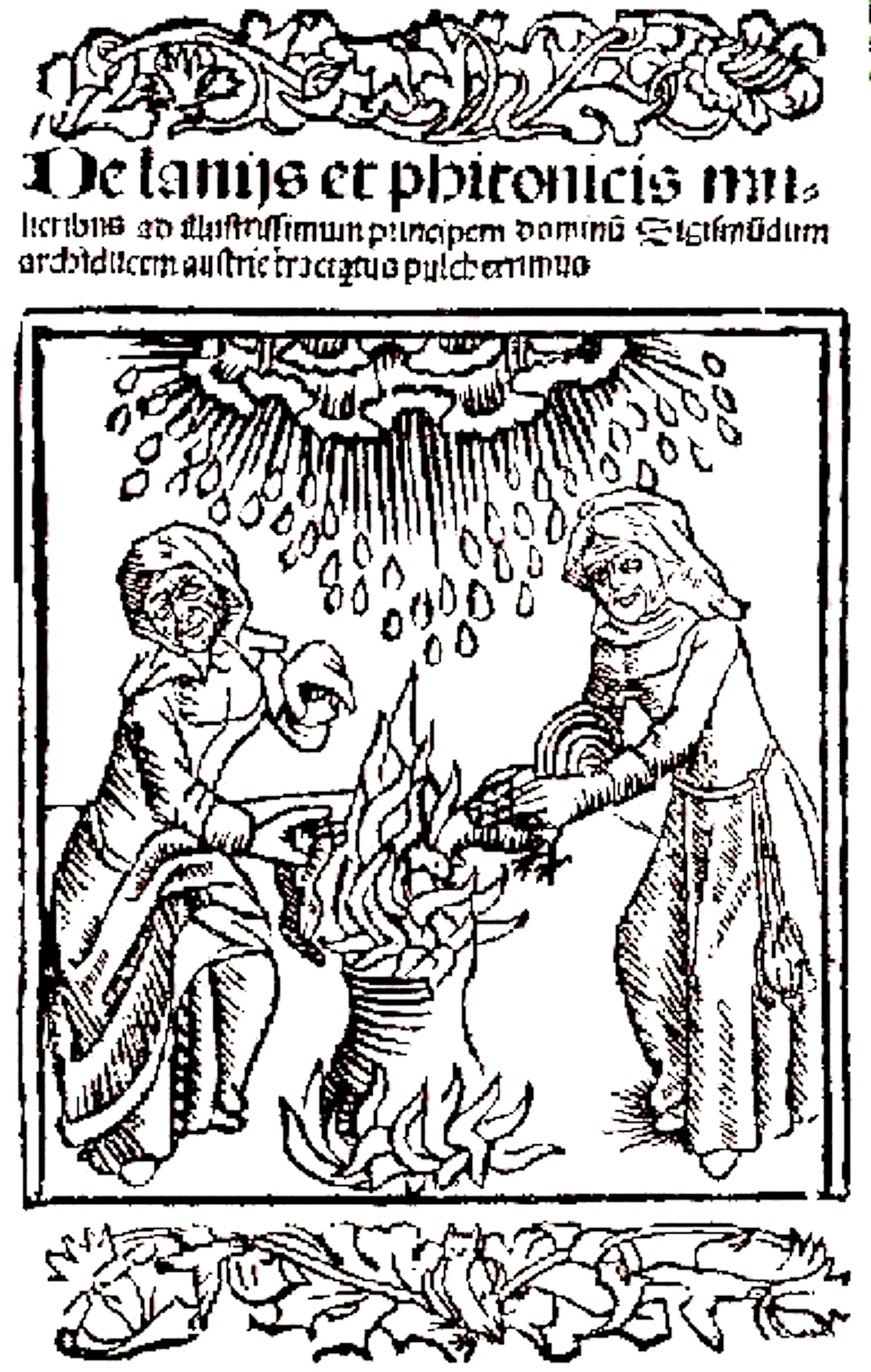 Naast de afbeeldingen van de heksenvlucht met het onweer in de achtergrond is in Molitors ‘De Lamiis…’ (‘Over de heksen…’) uit 1489 ook een afbeelding te vinden van de heksen als weertovenaressen: in een grote pot, die op het vuur staat te pruttelen gooien de heksen een haan en een slang, terwijl boven hen het onweer reeds uit de lucht neerkomt.
