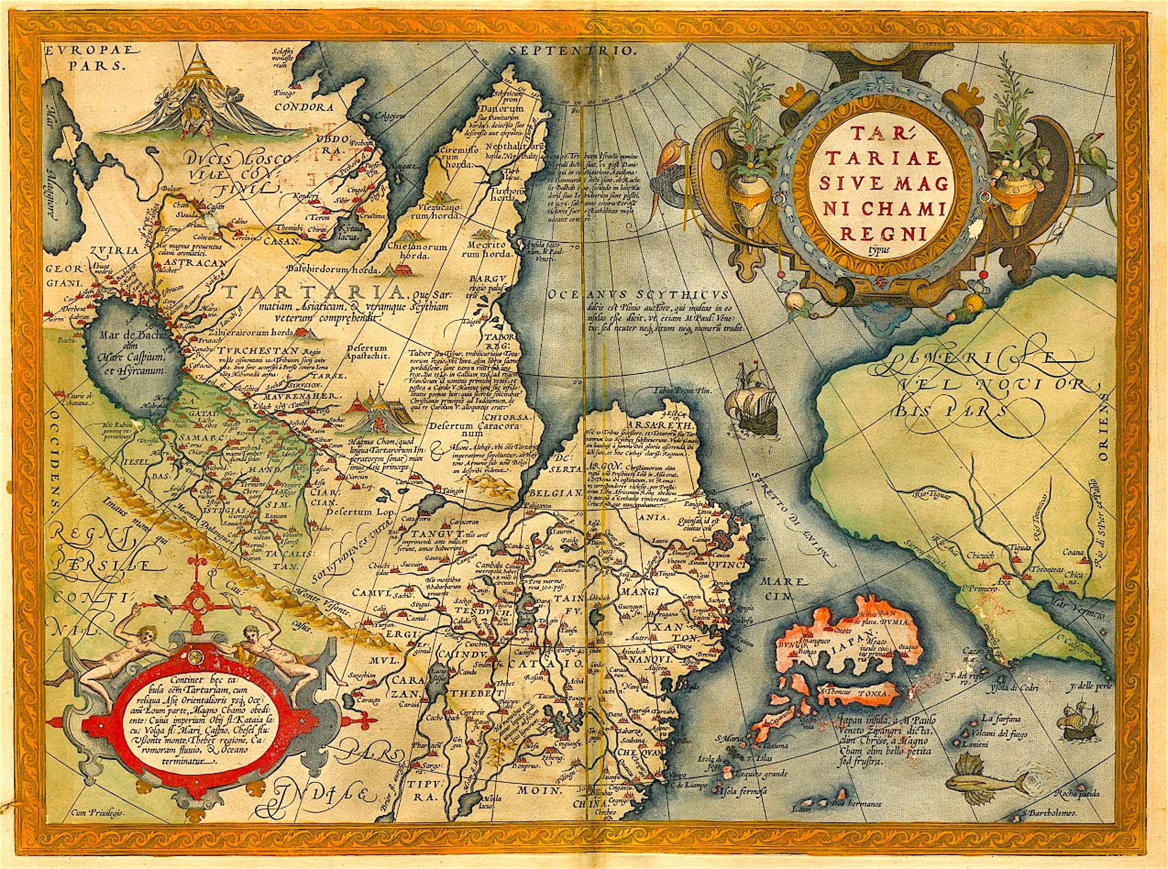 Een van de opmerkelijkste kaarten uit ’s werelds eerste atlas, het ‘Theatrum orbis terrarum’ van Abraham Ortelius, is kaart 47, getiteld: TARTARIAE SIVE MAGNI CHAMI REGNI typus oftewel ‘kaart van Tartarië oftewel het koninkrijk van de grote Khan’. Deze kaart is gebaseerd op de kaart van Azië, die weer veel dankt aan Ortelius’ kaart uit 1567 (‘Asiae orbis partium maximae nova descriptio’) en deze is aldus Ortelius’ woord aan de lezer grotendeels ontleend aan Gastaldi’s kaart van Azië. De kaart is ontworpen door Ortelius en net als alle kaarten in de atlas gegraveerd door Frans Hogenberg. In de 16e eeuw waren Centraal en Septentrionaal Azië nog onbekend. Voor onze kaart geldt dezelfde critiek als Koeman geeft voor de kaart van Azië: ‘Le Japon est si mal dessiné qu’on a peine à l’identifier, la Coree est omise. […] Il situe […] le Japon à 200º à l’est du méridien de Ferro (170º chez Mercator). En l’occurance, Ortelius a fait sienne, inconsidérément, la thèse classique de l’extension de l’Asie en direction de l’est.’ De kaart wordt beschreven in de cartouche in de linkeronderhoek: