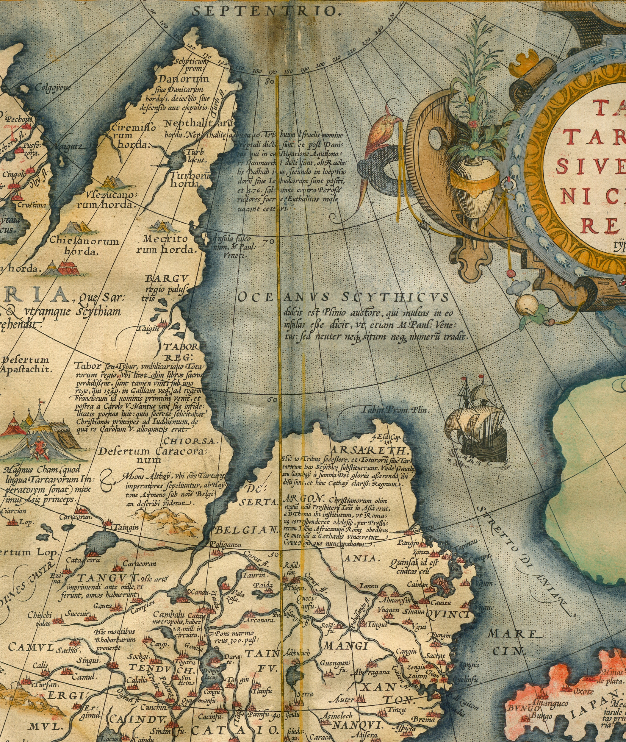 In het midden van de kaart bevindt zich de berg Altai, waar alle keizers van de Tartaren worden begraven, schijnt door Hayton de Armeen te zijn beschreven onder de naam Belgian. (Mons Althaÿ, vbi omnes Tartariæ imperatores sepeliuntur, ab Haÿtone Armeno sub nomine Belgian describi videtur.)