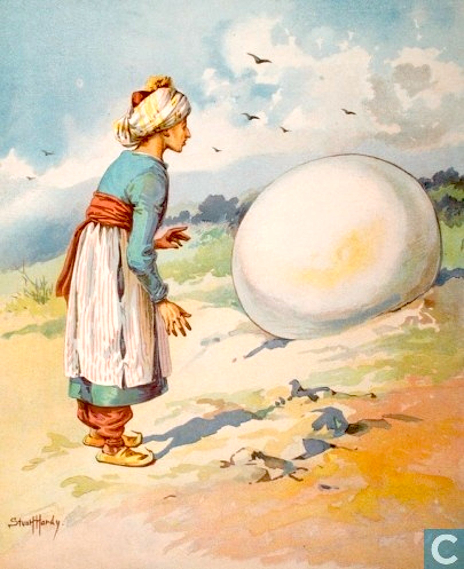Op zijn tweede reis wordt Sindbad per ongeluk achtergelaten op een eiland, waar hij in slaap is gevallen. Hij ontwaart tenslotte een enorme witte en gladde koepel van vijftig passen omvang. Het is het ei van een rokh. Wanneer de vogel komt om het te broeden, bevestigt Sindbad zich aan een poot van de vogel en wordt getransporteerd naar een diep dal, waaruit men niet kan komen en dat bezaaid is met diamanten. ’s Nachts zoekt hij een schuilplaats in een grot om aan de serpenten te ontsnappen, die sterk genoeg zijn om een olifant in te slikken en die ’s nachts uit hun schuilplaats komen. Hij ziet dat stukken vlees worden neergegooid door kooplui; aan deze stukken hechten de diamanten en adelaars brengen ze naar hun nesten. Sindbad verzamelt de grootste diamanten, bindt zichzelf aan het grootste stuk vlees, wordt naar een nest gebracht en bevrijd door een koopman, die de adelaar verjaagt; hij compenseert de koopman voor het door zijn schuld geleden verlies.[i]