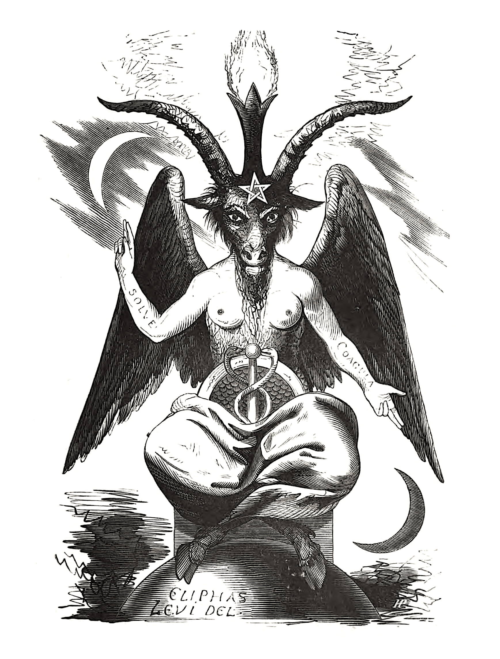 Solve Et Coagula is also seen on images of Baphomet, on the arms. Solve is on Baphomet S right arm with A hand pointing up at A crescent Sun, and Et Coagula is on Baphomet S left arm with A hand point down towards the Moon. The most popular, widely available, and frequently cited image of Baphomet, was created by French occultist, alchemist, and political socialist Éliphas Lévi Zahed (Alphonse Louis Constant), whose name is also visible on the image of Baphomet (https://Miriadic.fandom.com/wiki/Solve_et_coagula).