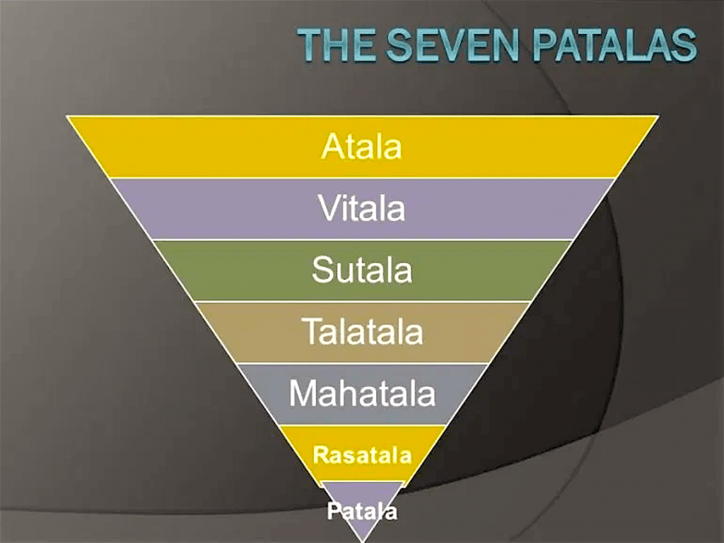Een belangrijk feit om op te merken is, dat de Patala’s over het algemeen worden beschouwd als onder de zee. Een andere grote karakteristiek is, dat ze bewoond worden door Danava’s (of demonen) en Naga’s (of Serpenten), die leven als menselijke wezens in fabuleus rijke steden en koninkrijken. Hun vrouwen zijn ook prachtig en ze hebben vaak zelfs huwelijksrelaties met Manushya’s (of menselijke wezens afstammend van Manu, zie https://en.wikipedia.org/wiki/Human_beings_in_Buddhism). De zeven Patala’s heten Atala, Bitala, Sutala, Talatala, Mahatala, Rasatala en Patala. Shri Nand Lal Dey in zijn boek “Rasatala” identificeert Patala’s met de regionen ten noordwesten van India, inclusief Turkestan, de Kaspische regio, Kaukasische regio, evenals de gebieden van Klein Azië. De belangrijke punten, die zijn theorie ondersteunen, zijn, dat een grote rivier genaamd “Rasa” in oude literatuur en nu de Oxus wordt genoemd in het gebied stroomt en daarom schijnt het woord Rasatala terecht gebruikt voor dit deel van het land. Ten tweede waren daar de Danava’s, Daitya’s, Garuda’s en Naga’s of Serpenten als de diverse menselijke naties, die deze gebieden bewonen. Zij konden eenvoudig in contact komen met de Manushya’s, die in Sapta-Sindhu woonden. De grote zwakte echter van zijn positie is, dat terwijl het plausibel kan lijken wanneer beschouwd in relatie tot de naam “Rasa”, het niet de andere zes Patala’s verklaart. Bovendien verklaart het ook niet het feit, dat Patala’s beschouwd worden onder de oceaan te liggen.