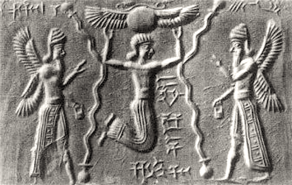 Zie https://nl.wikipedia.org/wiki/Anunnaki#/media/File:Mesopotamian_cylinder_seal_impression.jpg