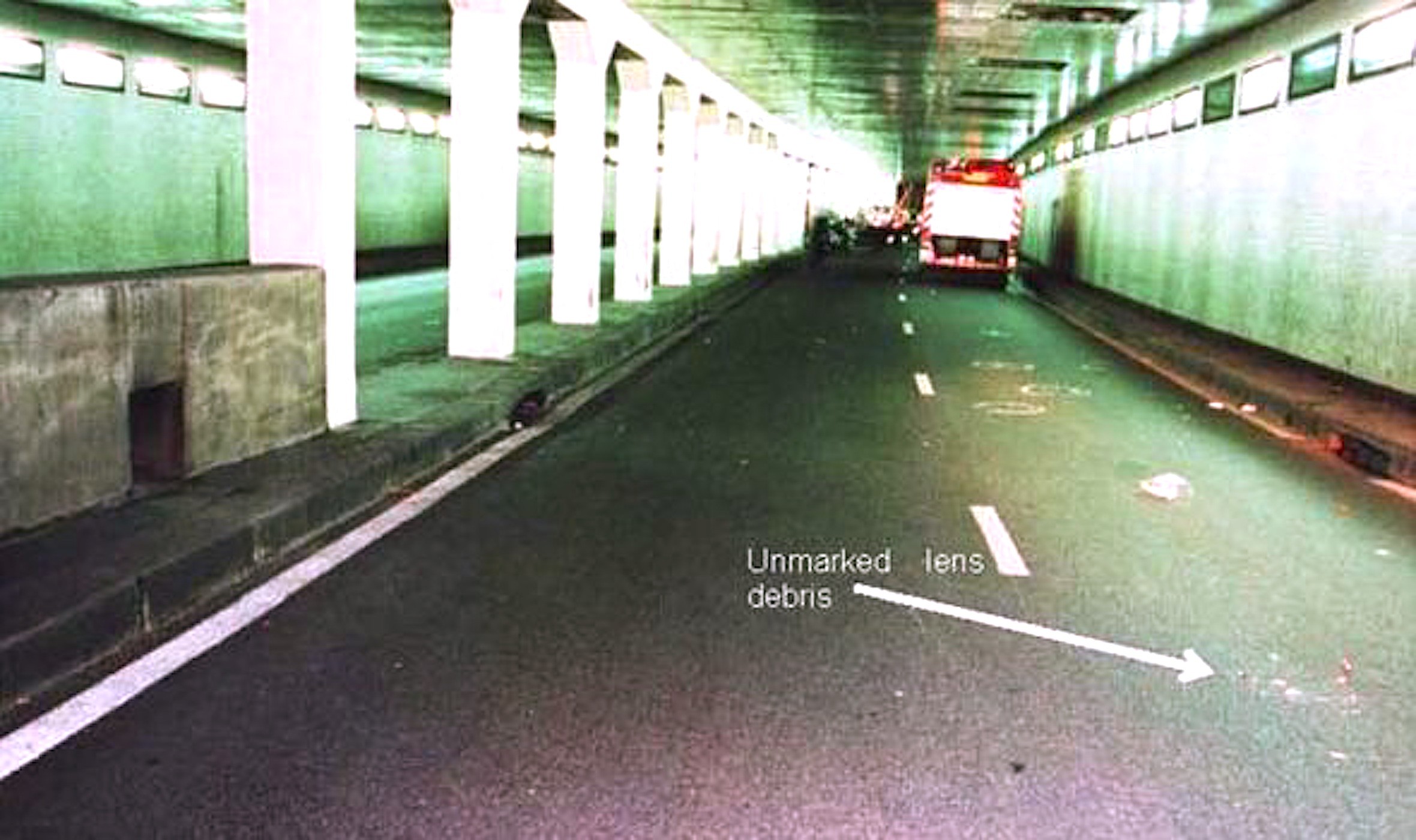 Animation: A motor bike ‘blocks’ the exit to the Champs Elysées and the Mercedes enters the tunnel. A white Fiat Uno overtakes the Mercedes on the right, which then moves into the left lane, closely along the pillars. The motor bike overtakes the car and flashes backwards. Mercedes crashes into the thirteenth pillar.