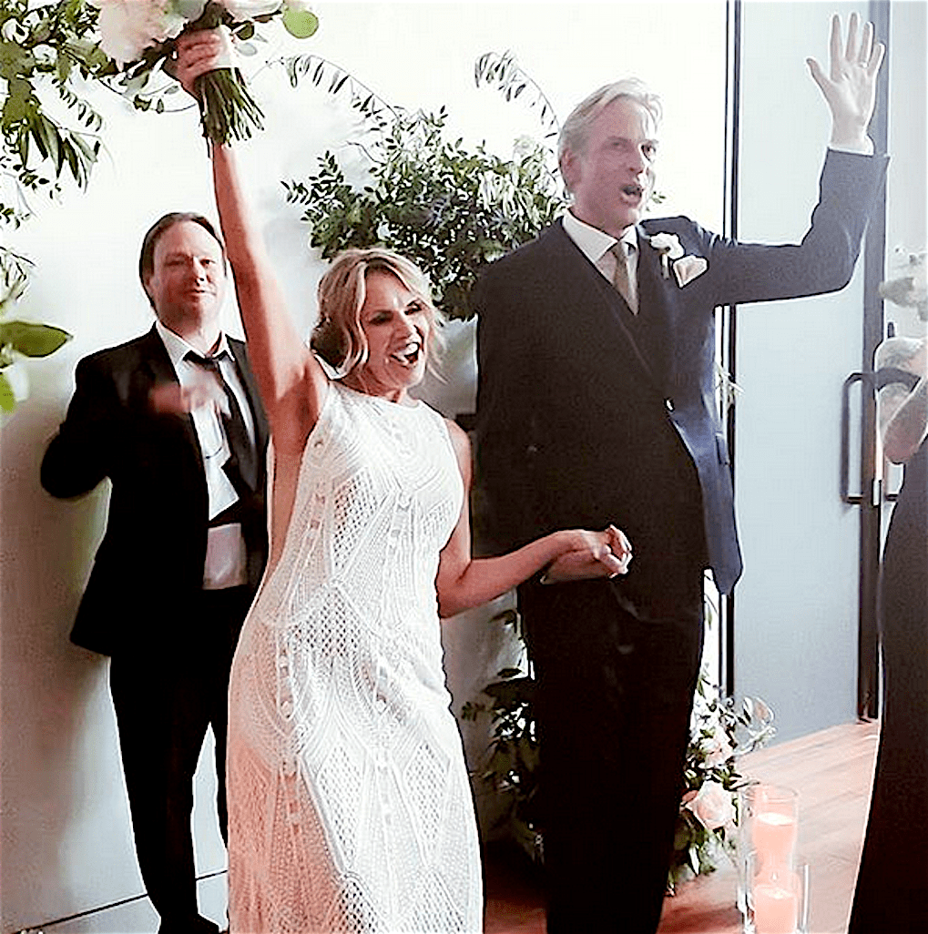 “En het is officieel!“, schrijft ze bij een foto van hen beiden in trouwkleding. Zij zwaait een bruidsboeket in de lucht. “Mr. & Mrs. Adam Curry.” In een eerdere post op Instagram wenste ze Adam Curry alvast een ’gelukkige trouwdag’ toe.