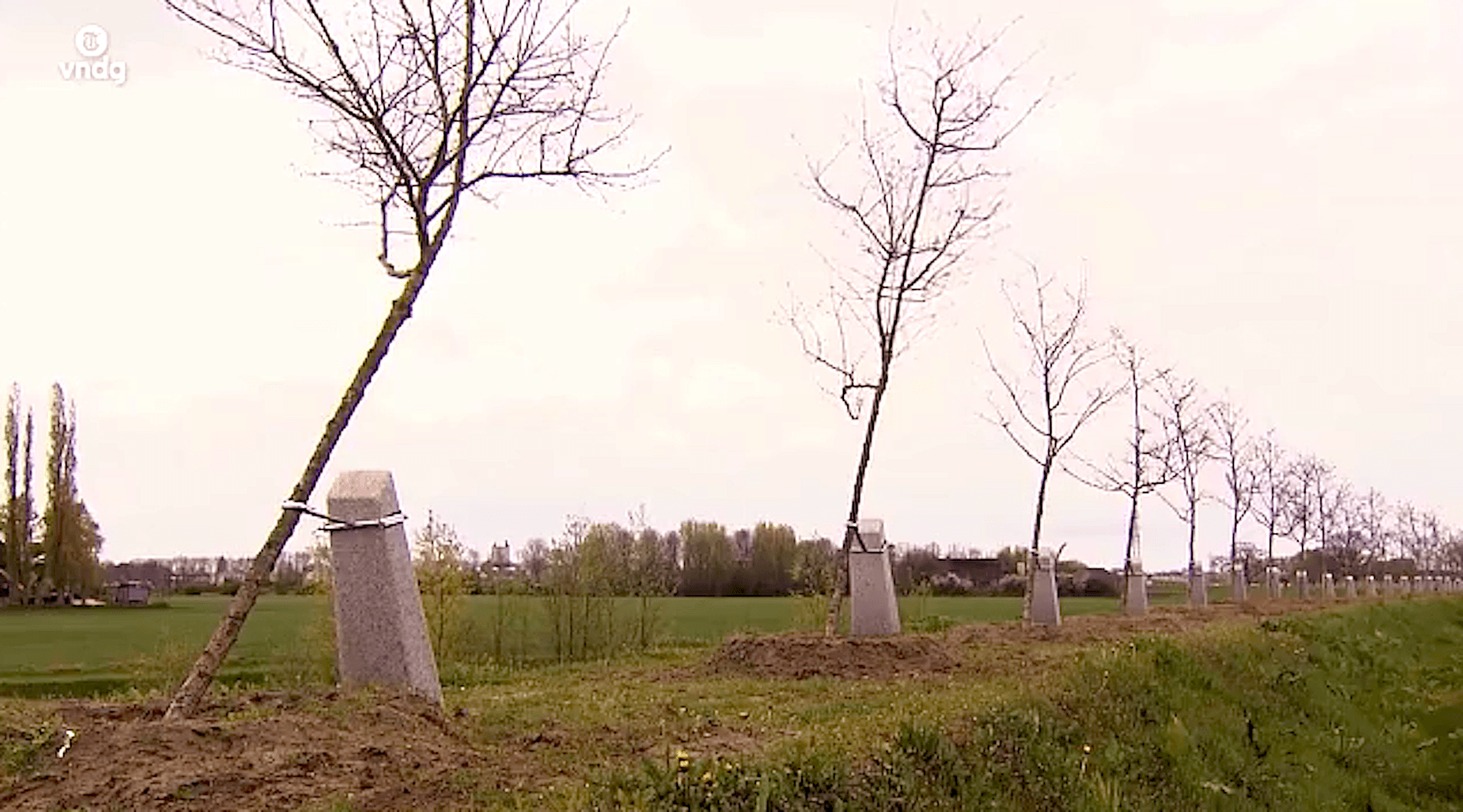 Het leek een prachtig kunstproject: 1300 bewust scheef geplante meidoorns. Maar bij de eerste storm vallen ze om. Het Telegraaf VNDG-programma ‘Weggegooid Geld’ gaat op onderzoek uit.