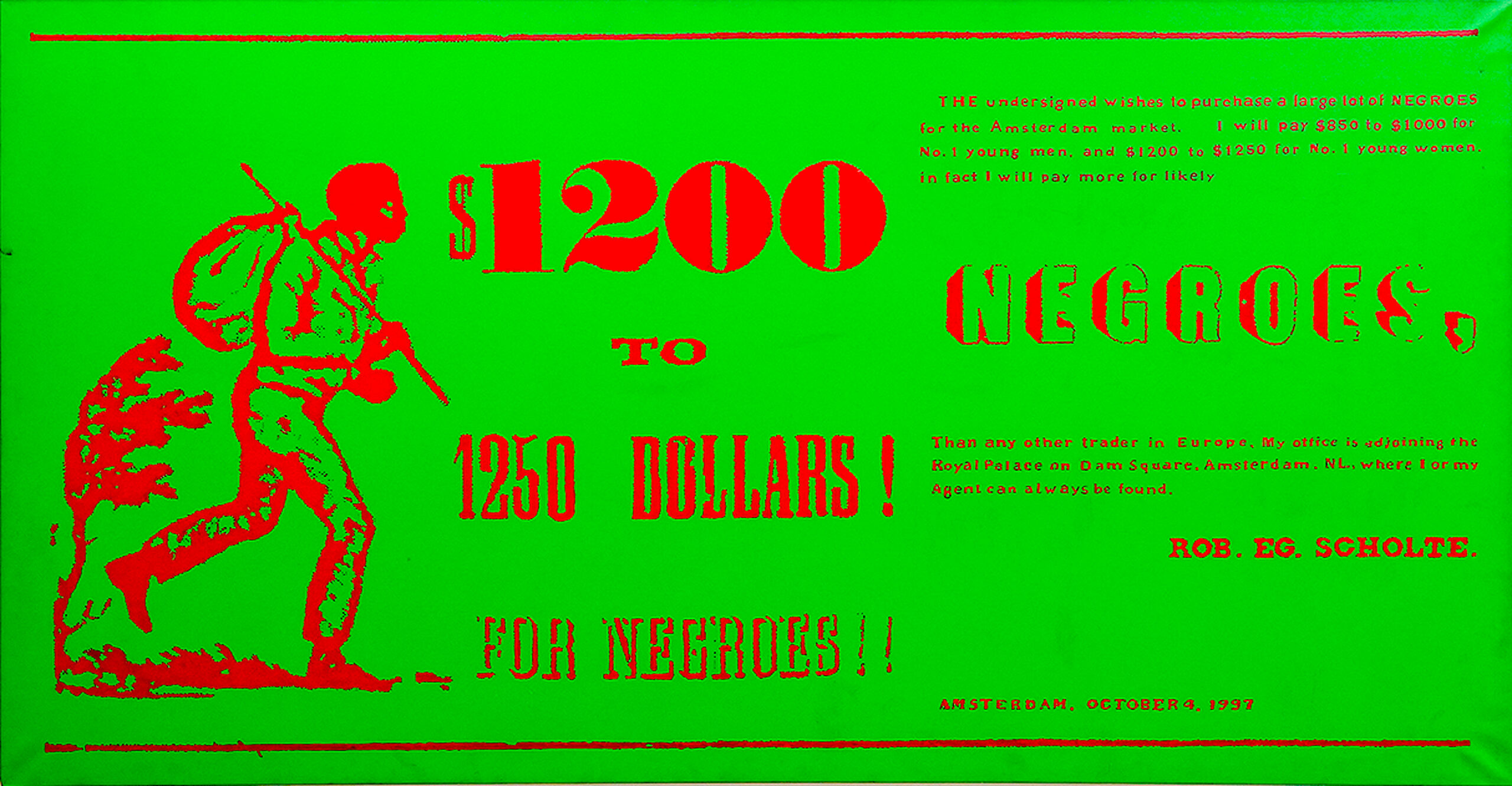 Met Gras Groene Acrylverf schilderde Kunstenaar Rob Scholte in 1997 een affiche na uit 1853, waarin een Amerikaanse Slaven Handelaar 1.250 Dollar biedt voor Young Women Negroes. De Naam van de Slaven Handelaar verandert hij Provocatief in ‘Rob Scholte’ en het jaartal in 1997, om zich vervolgens te verbazen over het Uit Blijven van Publieke Ophef. ‘Het is een Verschrikkelijk Schilderij, dat Vragen oproept rond Moraliteit, waar aan je Niet Voorbij kunt gaan’, benadrukt hij in een Interview. Voor een Expositie in Museum De Fundatie in Zwolle wordt voor Jeugdige Bezoekers een Uitleg geschreven: ‘Er waren Vroeger Veel Nederlanders, die Tot Slaaf Gemaakten Kochten en Verkochten. (…) Je krijgt een Rot Gevoel van dit Schilderij.’
