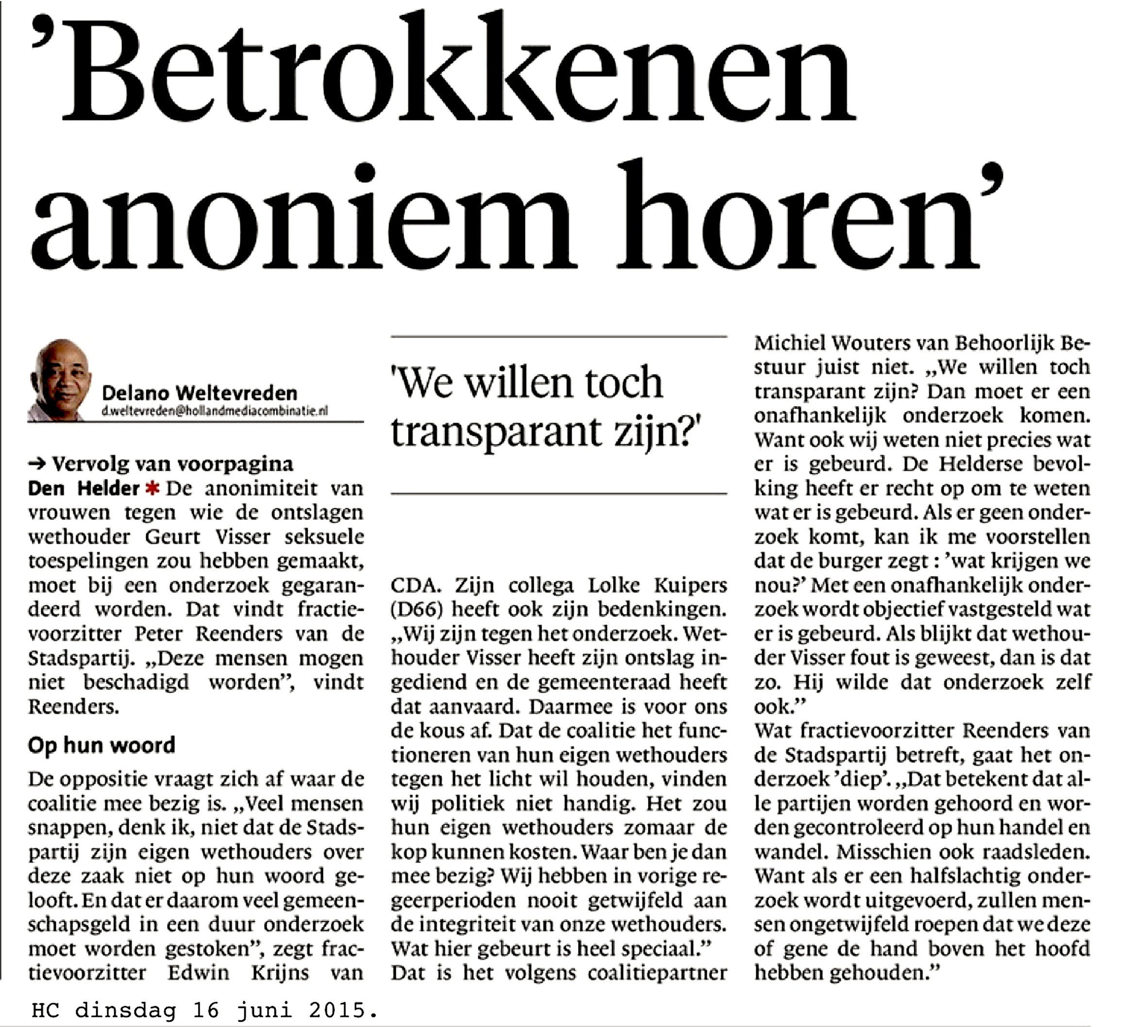 Delano Weltevreden – ‘Betrokkenen anoniem horen’ (Helderse Courant, 16 juni 2015) 17 juni 2015Businessplan, Home, Interview, Media0 Dit delen: Klik om te delen op Facebook (Opent in een nieuw venster) Facebook Klik om te delen op X (Opent in een nieuw venster) X