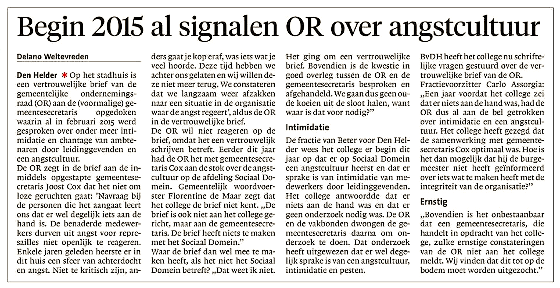 Delano Weltevreden – Begin 2015 al signalen OR over angstcultuur