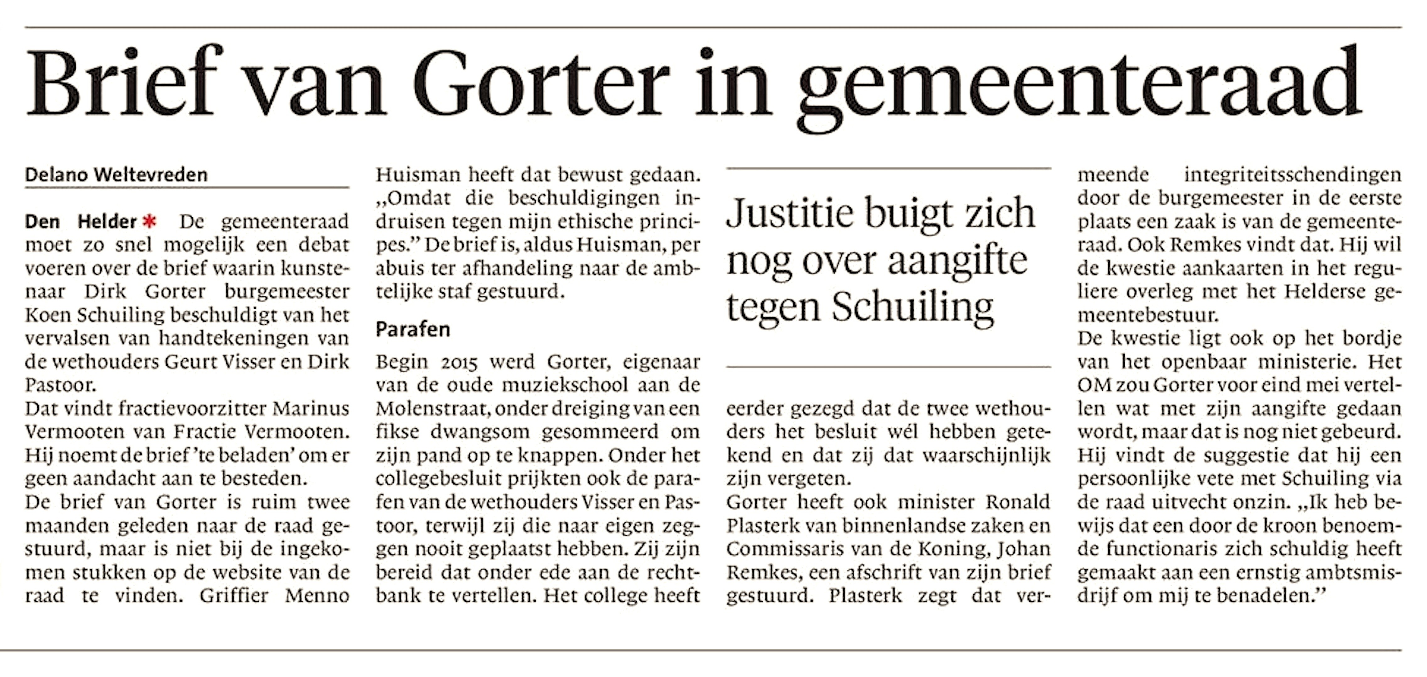 Delano Weltevreden – Brief van Gorter in gemeenteraad: Justitie buigt zich nog over aangifte tegen Schuiling 14 juni 2017Businessplan, Home, Interview, Locatie, Media0 Helderse Courant, 14 juni 2017 https://www.noordhollandsdagblad.nl/den-helder-eo https://robscholtemuseum.nl/dirk-gorter-schriftelijke-vragen-gericht-aan-gemeenteraad-den-helder-over-de-integriteit-van-burgemeester-koen-schuiling/ Dit delen: Afdrukken (Opent in een nieuw venster) Print E-mail een link naar een vriend (Opent in een nieuw venster) E-mail Delen op Pinterest (Opent in een nieuw venster) Pinterest Delen op Bluesky (Opent in een nieuw venster) Bluesky Delen op Nextdoor (Opent in een nieuw venster) Nextdoor Delen op LinkedIn (Opent in een nieuw venster) LinkedIn Delen op WhatsApp (Opent in een nieuw venster) WhatsApp Delen op Threads (Opent in een nieuw venster) Threads Delen op Tumblr (Opent in een nieuw venster) Tumblr Delen op Mastodon (Opent in een nieuw venster) Mastodon Delen op Reddit (Opent in een nieuw venster) Reddit Share op Facebook (Opent in een nieuw venster) Facebook Delen op Telegram (Opent in een nieuw venster) Telegram Delen op X (Opent in een nieuw venster) X