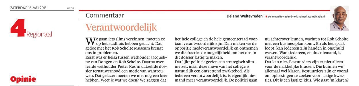 Dat lijkt politiek gezien een strategisch slimme zet, maar deze move van het college is natuurlijk een ontzettend zwaktebod. Als iedereen verantwoordelijk is, is eigenlijk niemand meer verantwoordelijk, De politici gaan nu achterover leunen, wachten tot Rob Scholte met een businessplan komt. En als het spaak loopt, kan iedereen zijn handen in onschuld wassen. Want iedereen, en dus niemand is verantwoordelijk.