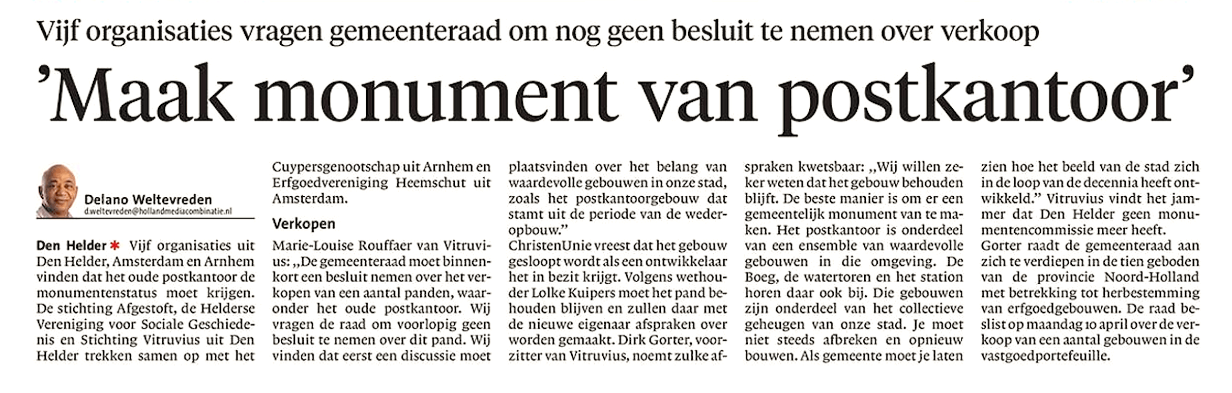 Delano Weltevreden – ‘Maak monument van postkantoor’ 8 april 2017Businessplan, Home, Interview, Locatie, Media1 Noordhollands Dagblad, 7 april 2017 https://www.noordhollandsdagblad.nl/den-helder-eo Dit delen: Klik om te delen op Facebook (Opent in een nieuw venster) Facebook Klik om te delen op X (Opent in een nieuw venster) X