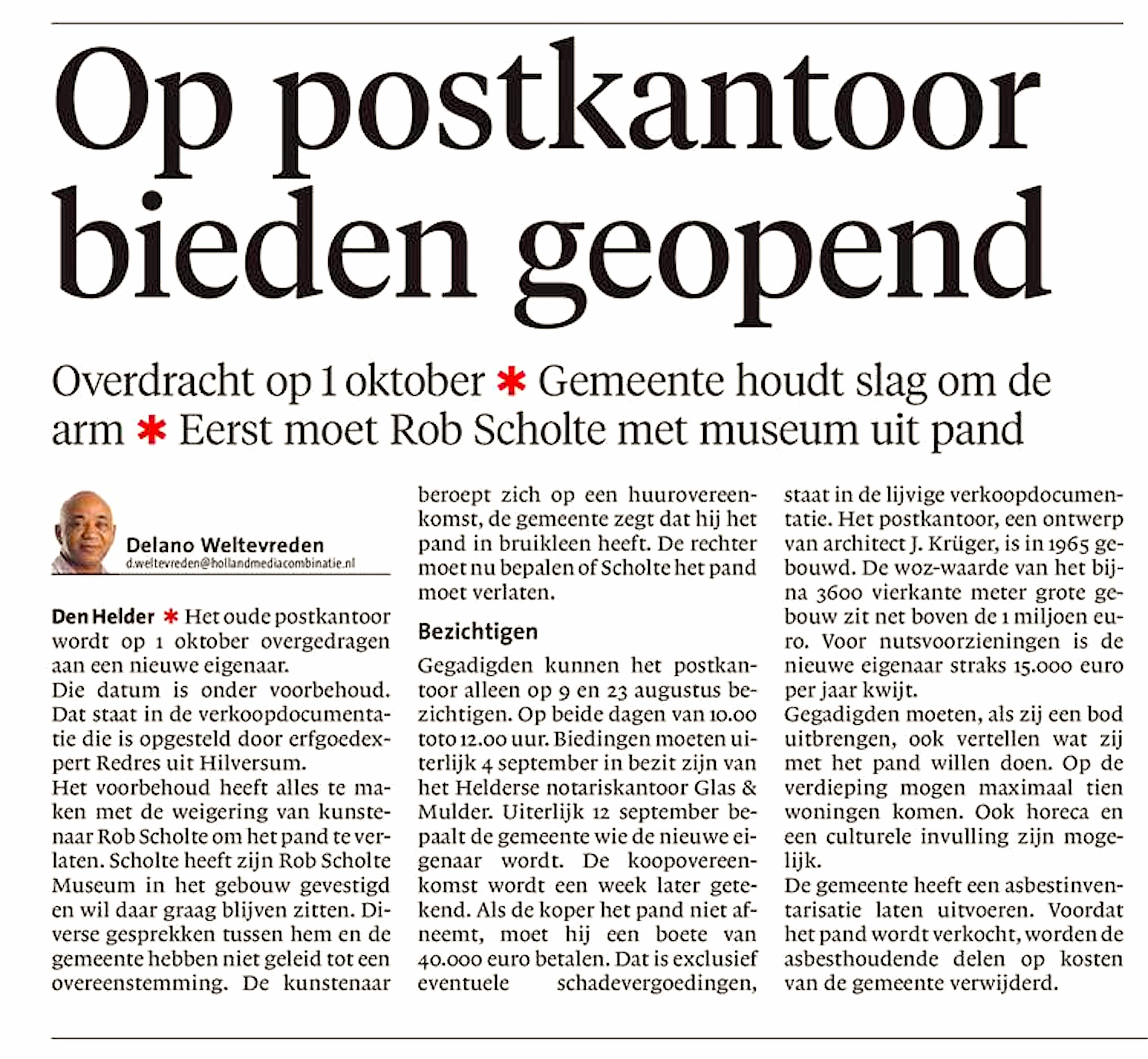 Gegadigden kunnen het postkantoor alleen op 9 en 23 augustus bezichtigen. Op beide dagen van 10.00 tot 12.00 uur. Biedingen moeten uiterlijk 4 september in bezit zijn van het Helderse notariskantoor Glas & Mulder. Uiterlijk 12 september bepaalt de gemeente, wie de nieuwe eigenaar wordt. De koopovereenkomst wordt een week later getekend. Als de koper het pand niet afneemt, moet hij een boete van 40.000 euro betalen. Dat is exclusief eventuele schadevergoedingen, staat in de lijvige verkoopdocumentatie. Het postkantoor, een ontwerp van architect J. Krüger, is in 1965 gebouwd. De WOZ-waarde van het bijna 3600 vierkante meter grote gebouw zit net boven de 1 miljoen euro. Voor nutsvoorzieningen is de nieuwe eigenaar straks 15.000 euro per jaar kwijt.
