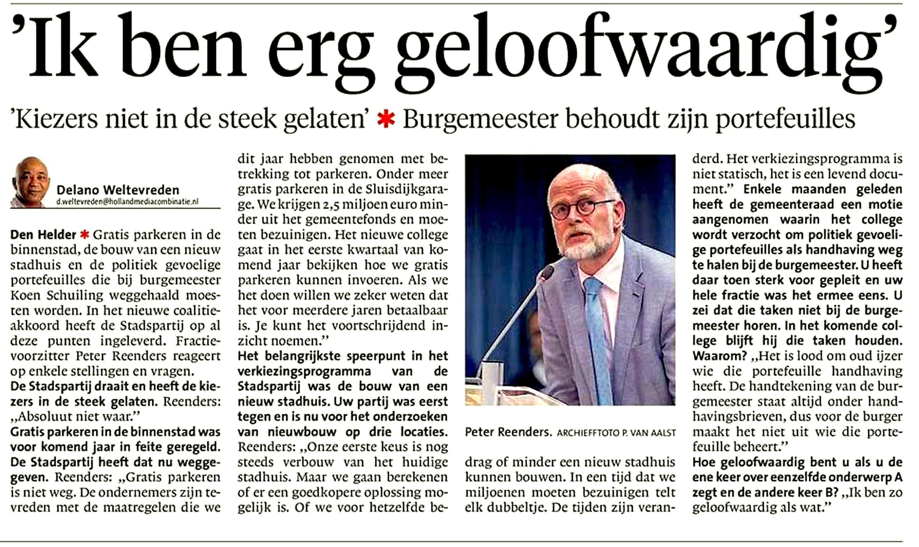Dit zal voor eeuwig een sleutelinterview blijven met betrekking tot Peter Reenders. Het verwijt dat partijen die aan een coalitie deelnemen, niet alle punten uit hun partijprogramma hebben kunnen verwezenlijken, is volstrekt onterecht, tenzij de kiezers die partij een absolute meerderheid verschaffen. De stad moet bestuurd worden en dat gaat alleen als alle partijen die tot een college toetreden, wat water bij de wijn doen. Daar is niets mis mee. Maar Reenders zegt hier iets heel anders; “Het verkiezingsprogramma is een levend document”. Met andere woorden, de uitgangspunten die ik zeg na te streven en waarop ik gekozen ben, staan niet voor vier jaar vast, nee ik kan ze naar believen elk moment veranderen. Daarmee haalt Reenders de fundamenten onder onze democratie vandaan. Wie ooit nog zo oerstom is om op de Stadspartij te stemmen, geeft Reenders dus een levende open machtiging om naar believen te doen wat hem uitkomt. Of kort samengevat; hij hijst een dictator in het zadel.