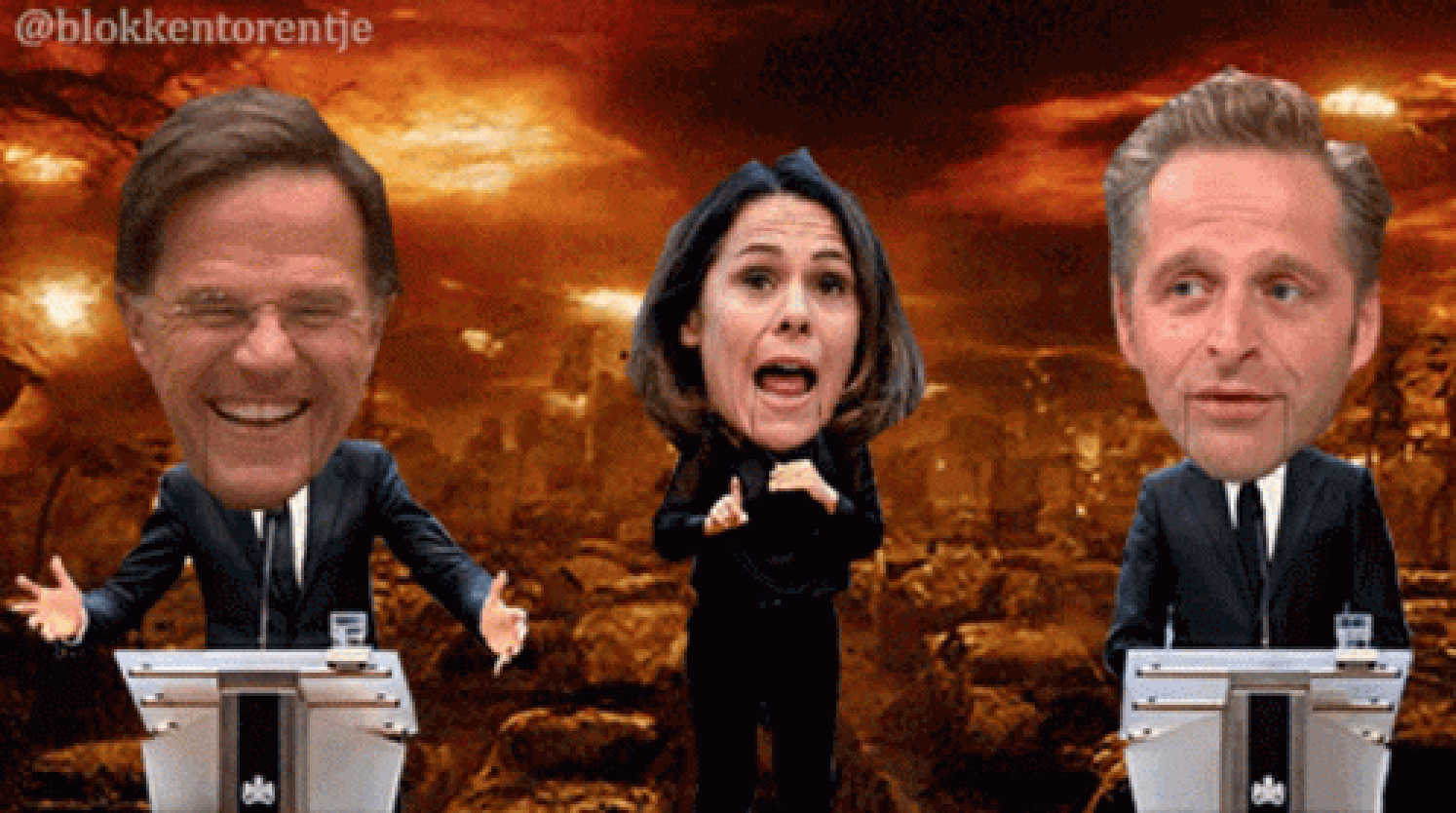 Persconferentie van Mark Rutte & Hugo de Jonge, in het midden de doventolk Irma (foto Blokkentorentje)