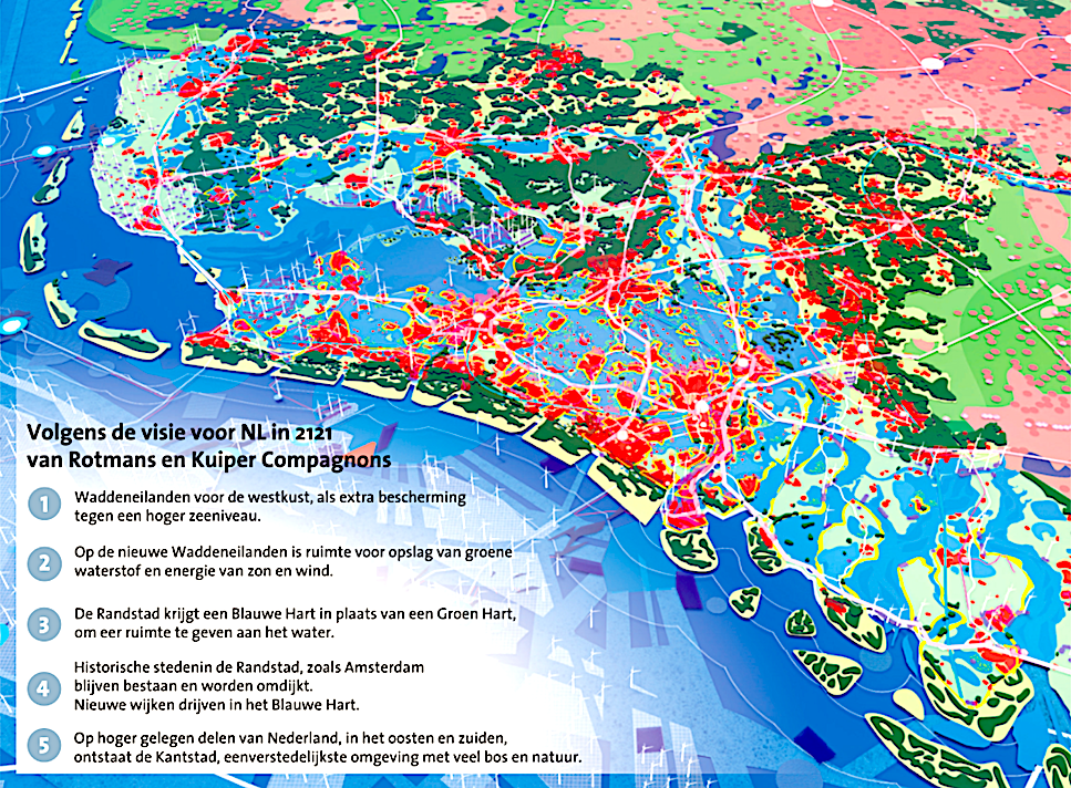 Het Groene Hart zal Plaats Maken voor het Blauwe Hart, als Antwoord op de Gestage Zee Spiegel Stijging en Meer Water Af Voer van de Rivieren, Voor Spelt Transitie Hoog Leraar Jan Rotmans. De Rand Stad Verandert, denkt hij, in een Groen Blauwe Metropool met Omdijkte Historische Steden, Drijvende Wijken en Nieuwe Wadden Eilanden voor de West Kust. Verzet tegen het Water, noemt Rotmans ’Niet Meer Vol Houdbaar’.