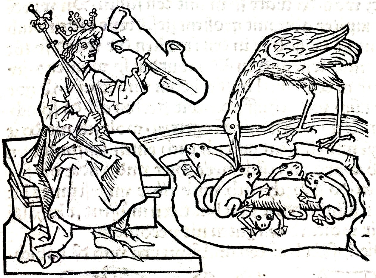 De kikkers maken elkaar wijs dat ze een krachtig leider missen. Iemand die streng doch rechtmatig over hen heerst en wiens dienaar ze kunnen zijn. Als de vacature, in de persoon van de reiger, is vervuld, blijkt zijn leiderschap in te houden dat hij de kikkers stuk voor stuk opvreet.