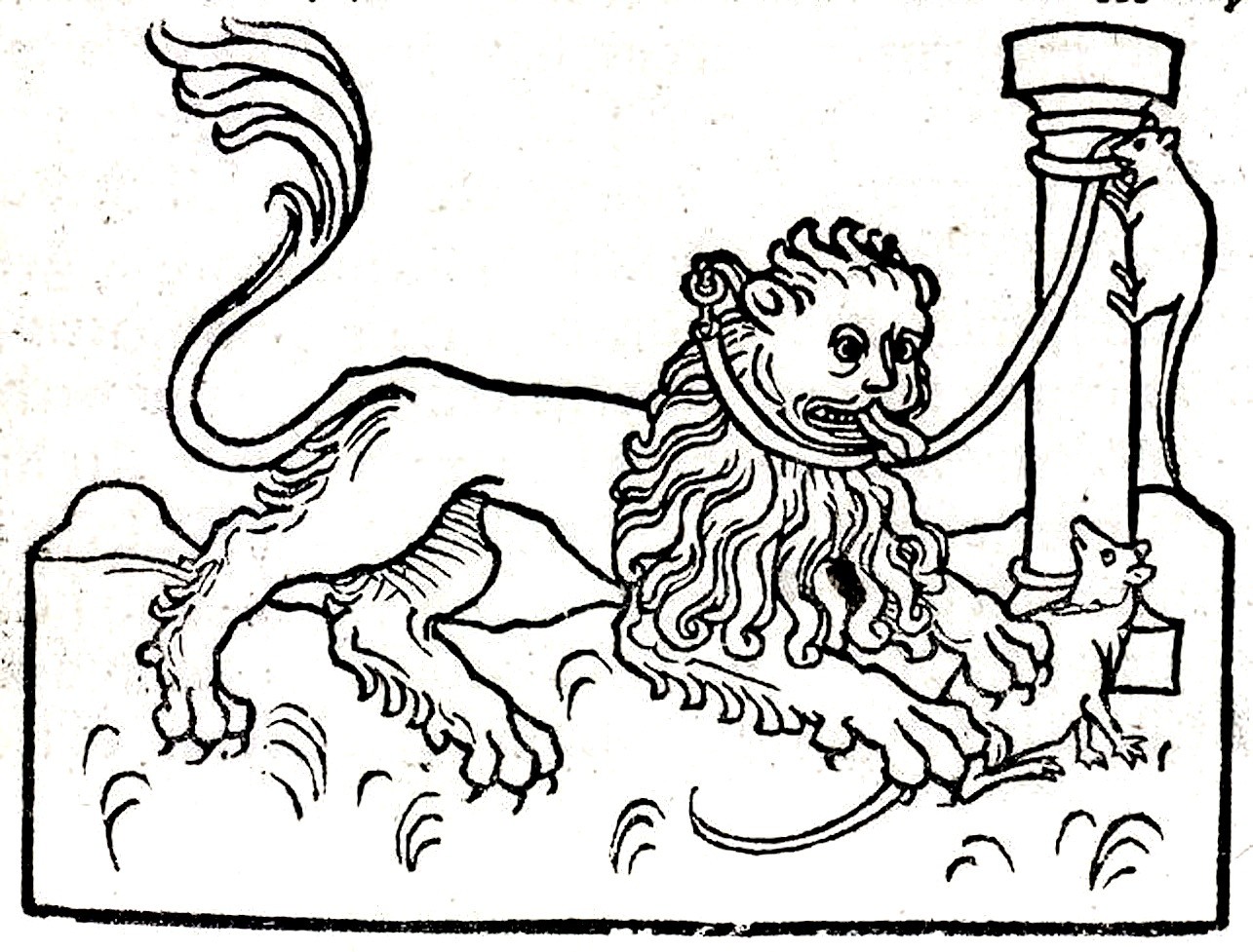 Waarop de leeuw uit medelijden het arme beestje laat lopen. Even later komt de leeuw vast te zitten in een strik en begint hij uit alle macht te brullen. En ja hoor, daar komt het knaagdier al aangetrippeld.