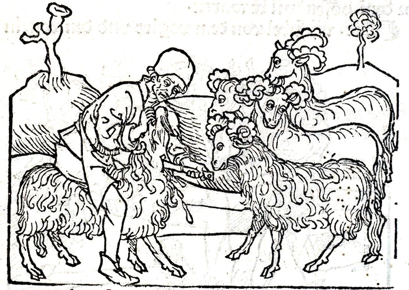 Een groep rammen staat in een omheinde wei. Als ze de slager zien aankomen, duwt de een de ander naar voren, en proberen ze zich achter elkaar te verstoppen. Maar terwijl de rest terugdeinst, doodt de slager eenvoudig de eerste de beste die hij te pakken krijgt.