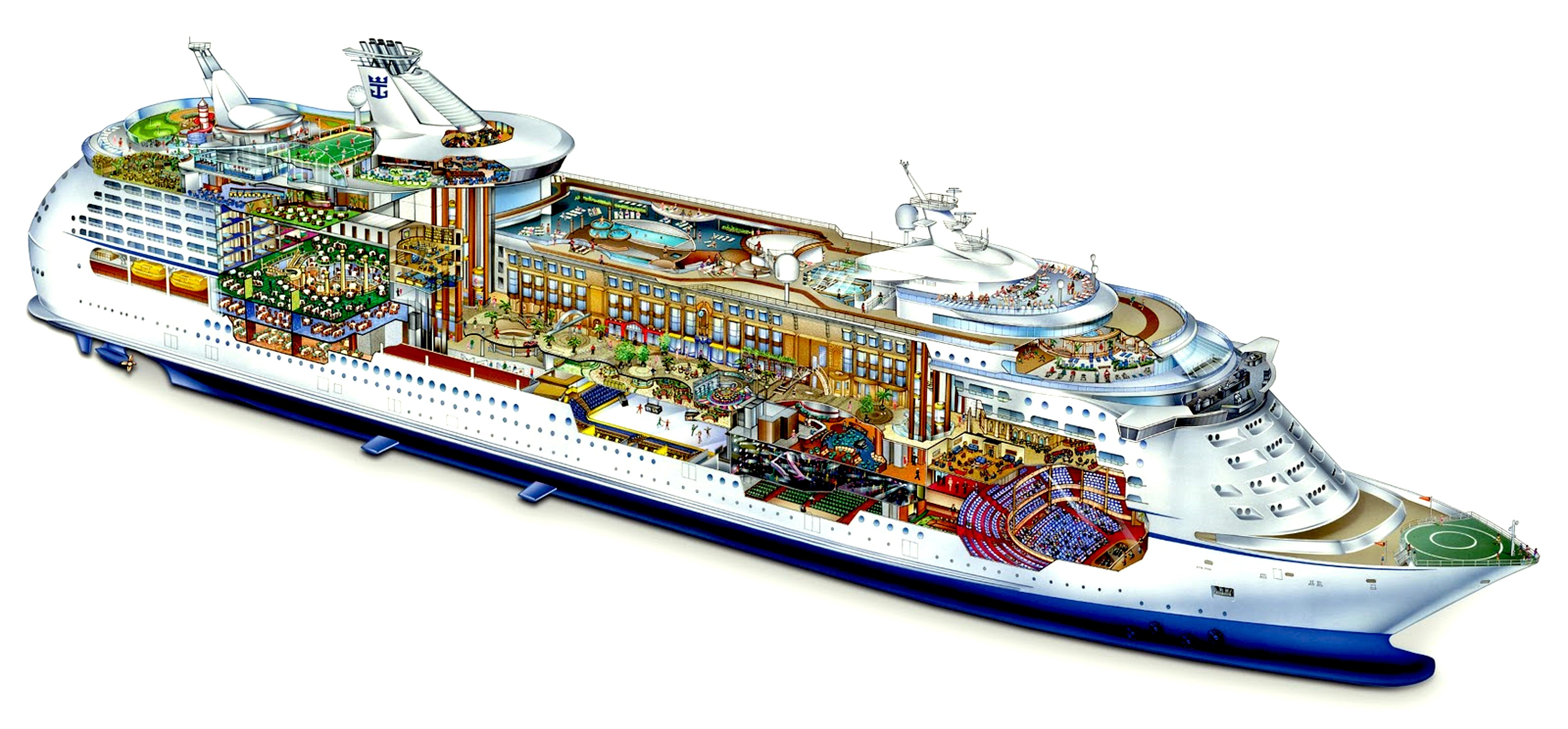 Casino’s, sauna’s, zwembaden op de diverse dekken, tennisbanen, een bioscoop, restaurants, bibliotheek, winkels. Al met al vormde het, mede door de verschillende klassen, gewoon een maatschappij op zich.