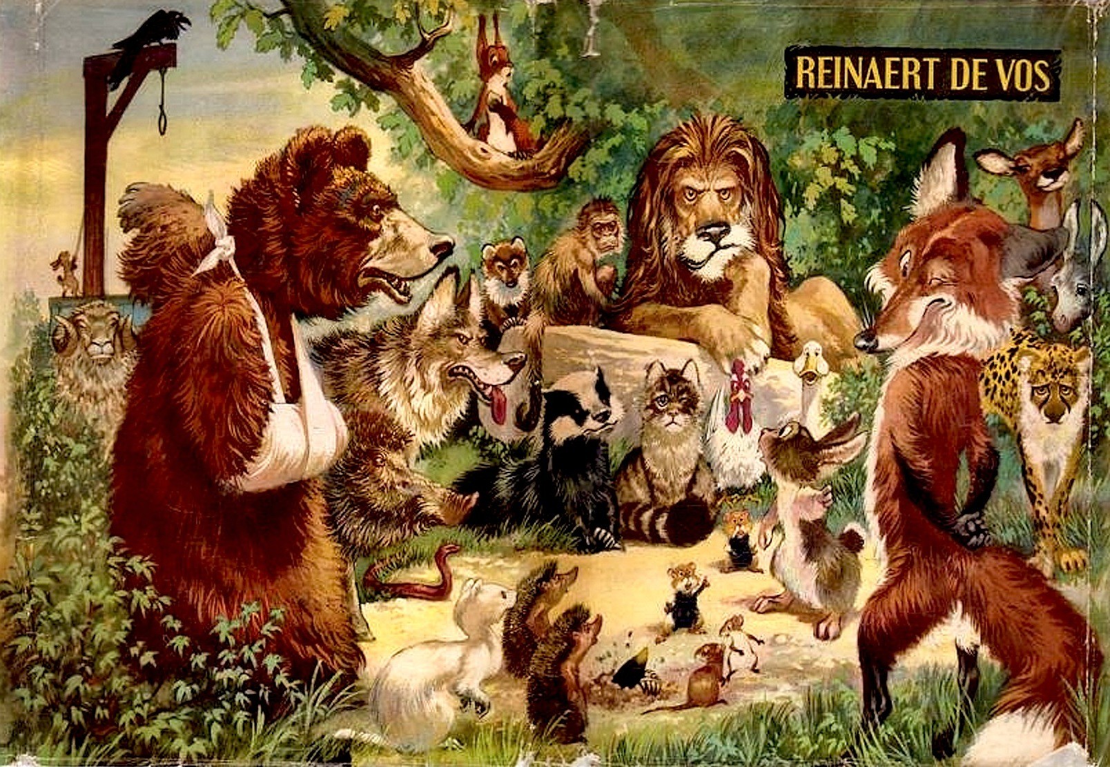 “Goed, in de loop van mijn verhaal komen de namen van de verraders vanzelf aan de orde. Mijn vader had zich een schat toegeëigend. Van koning Ermerike, om precies te zijn. Hierdoor voelde hij zich heel wat en begon hij op de andere dieren neer te kijken. Dus smeedde hij een plan om de macht te grijpen door de koning uit de weg te ruimen. Tibeert, Grimbeert, Izengrijn en Bruun, die nota bene de nieuwe koning moest worden, sloten zich bij hem aan. Een keer begint mijn neef de das, na een aantal wijntjes, tegen mijn vrouw te pochen over een of andere samenzwering. Ze belooft het geheim te houden maar brieft uiteraard alles later aan me door. Stel je voor, in plaats onze barmhartige Nobel, zo’n valse botte beer als koning! Ik moest er niet aan denken. Dus ik besluit er iets tegen te gaan doen. Om mijn vader de schat afhandig te kunnen maken, begin ik hem te bespioneren. Een keer zie ik hem om zich heen loerend uit een hol komen en de ingang camoufleren met takken en bladeren. Terwijl hij wegloopt wist hij met zijn staart de sporen uit. Hij is nog niet uit zicht of ik maakt dat hol open en kruip naar binnen. Stuit ik me daar toch op een enorme buit zeg! Zoveel goud en zilver heeft niemand van jullie ooit bij elkaar gezien. Enfin, mijn vrouw en ik gaan direct aan de slag. Twee dagen kost het ons om alles naar een ander hol te slepen. In een klap zijn we schatrijk! Het geld was bedoeld om soldaten in te huren en te gebruiken als smeergeld. Maar als mijn vader een tijdje later de schat op wil halen en deze verdwenen blijkt, vallen zijn snode plannen in het water en verhangt hij zich uit pure ellende. Snapt u nu hoe vreemd het is om hier als terdoodveroordeelde te staan, terwijl Izengrijn en Bruun nog altijd tot uw voornaamste raadsleden behoren?”