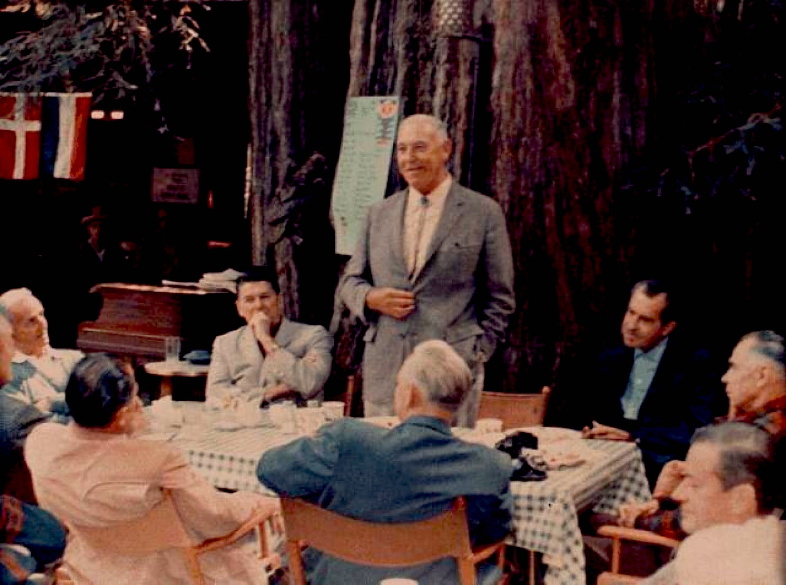 Two Future US Presidents, Ronald Reagan and Richard Nixon, are Pictured with Harvey Hancock (standing) and Others at Bohemian Grove in the Summer of 1967. (foto Ernest Orlando Lawrence | Berkeley National Laboratory)