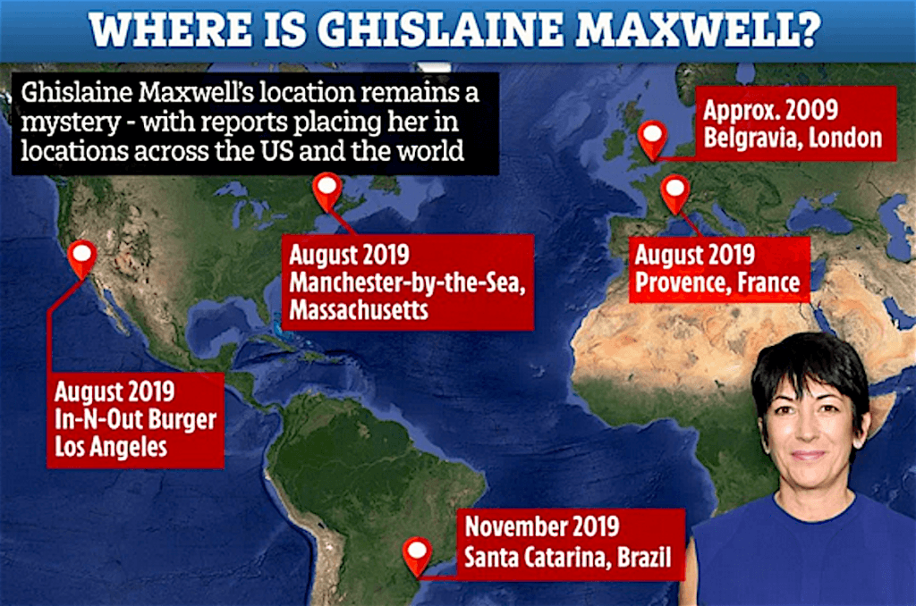 It was recently claimed that Maxwell had been traced to the Brazilian riviera, along with Epstein’s friend and alleged “fixer” Jean-Luc Brunel (https://www.thesun.co.uk/news/10009099/jeffrey-epstein-jean-luc-brunel-found-south-america/), who has also disappeared.