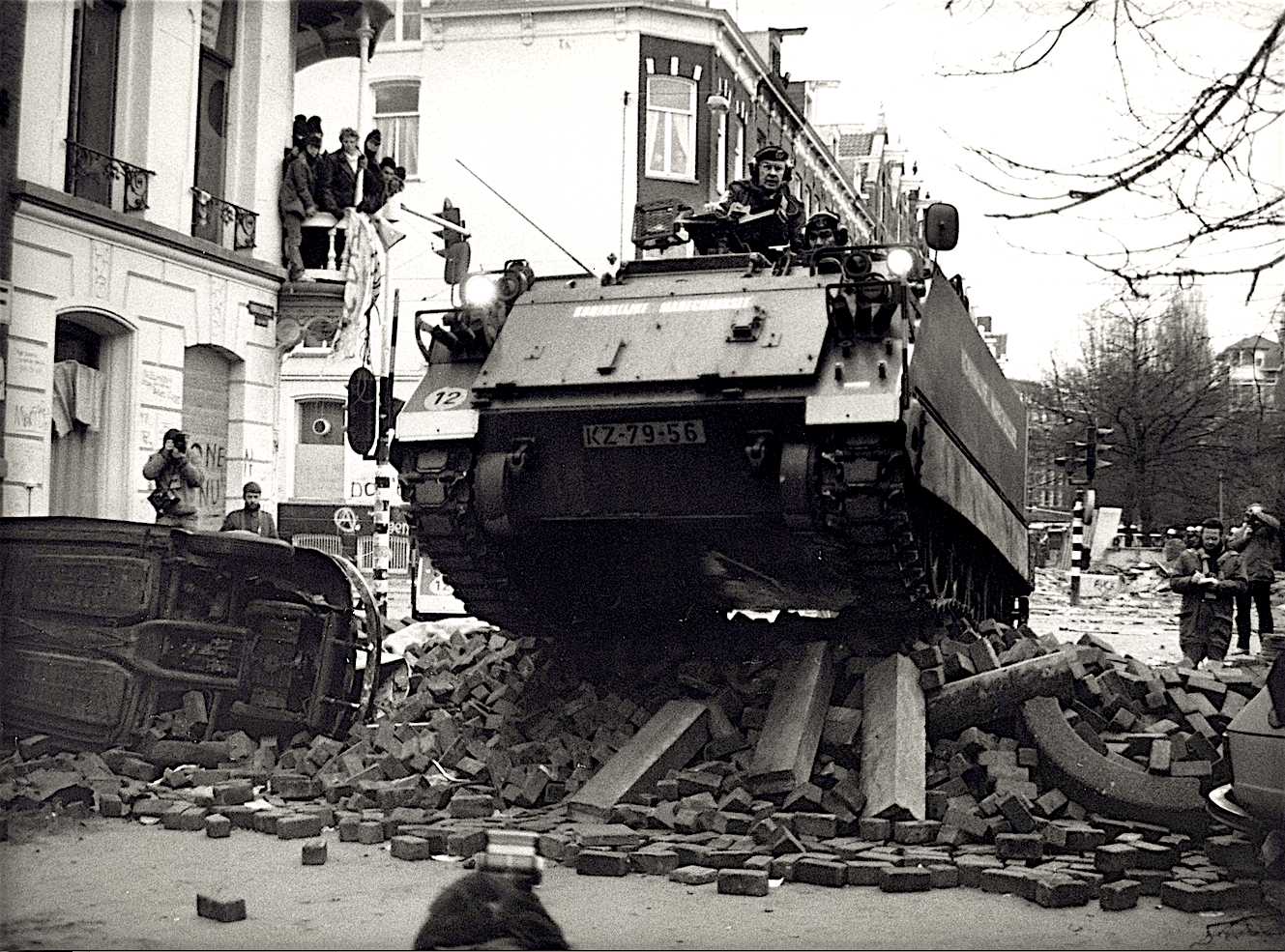 Opruiming van barricades door tanks bij de krakersrellen in de Vondelstraat, Amsterdam, 3 maart 1980 (foto Nationaal Archief / Collectie Spaarnestad)