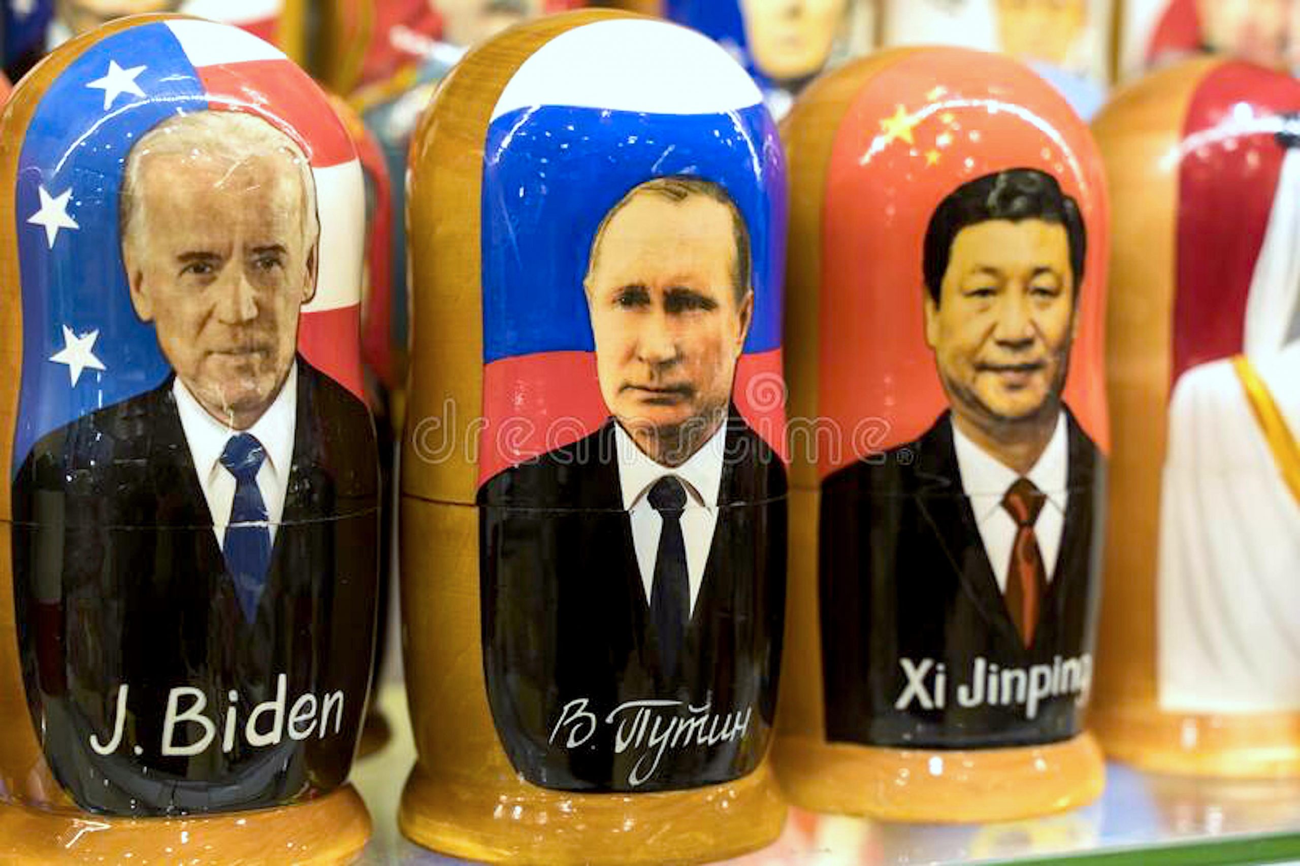 Vladimir Putin, Joseph Biden and Xi Jinping form Russian Nesting Dolls in A Moscow Gift Shop (1) (foto dreamstime.com)