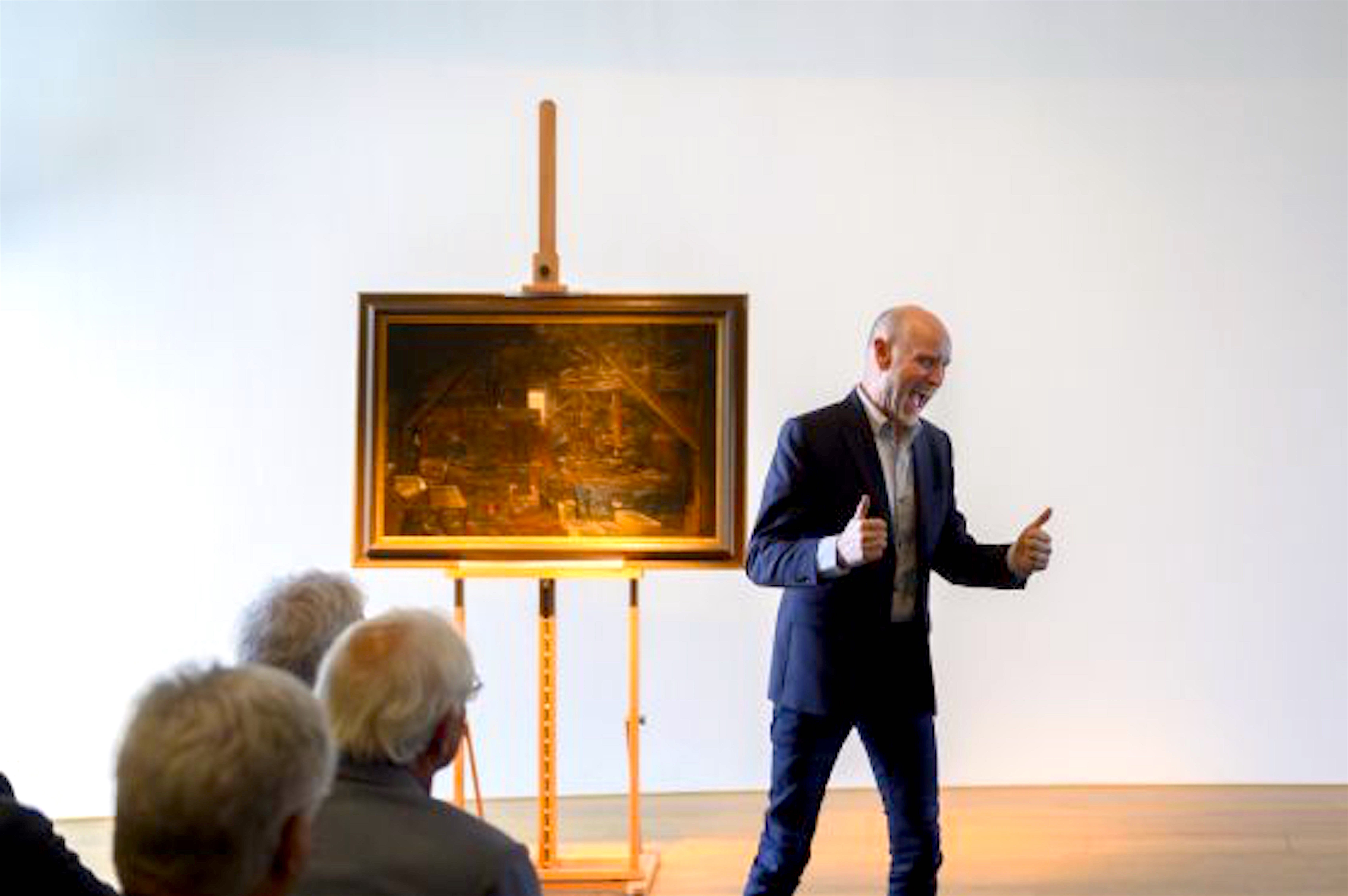 Curator van het museum Hester Wandel legt uit waarom het schilderij voor hen veel waarde heeft. Dat doet ze liefdevol, terwijl ze de verslaggever regelmatig even bezorgd waarschuwt als hij iets aanwijst. “Kijk uit met die pen, hè.”